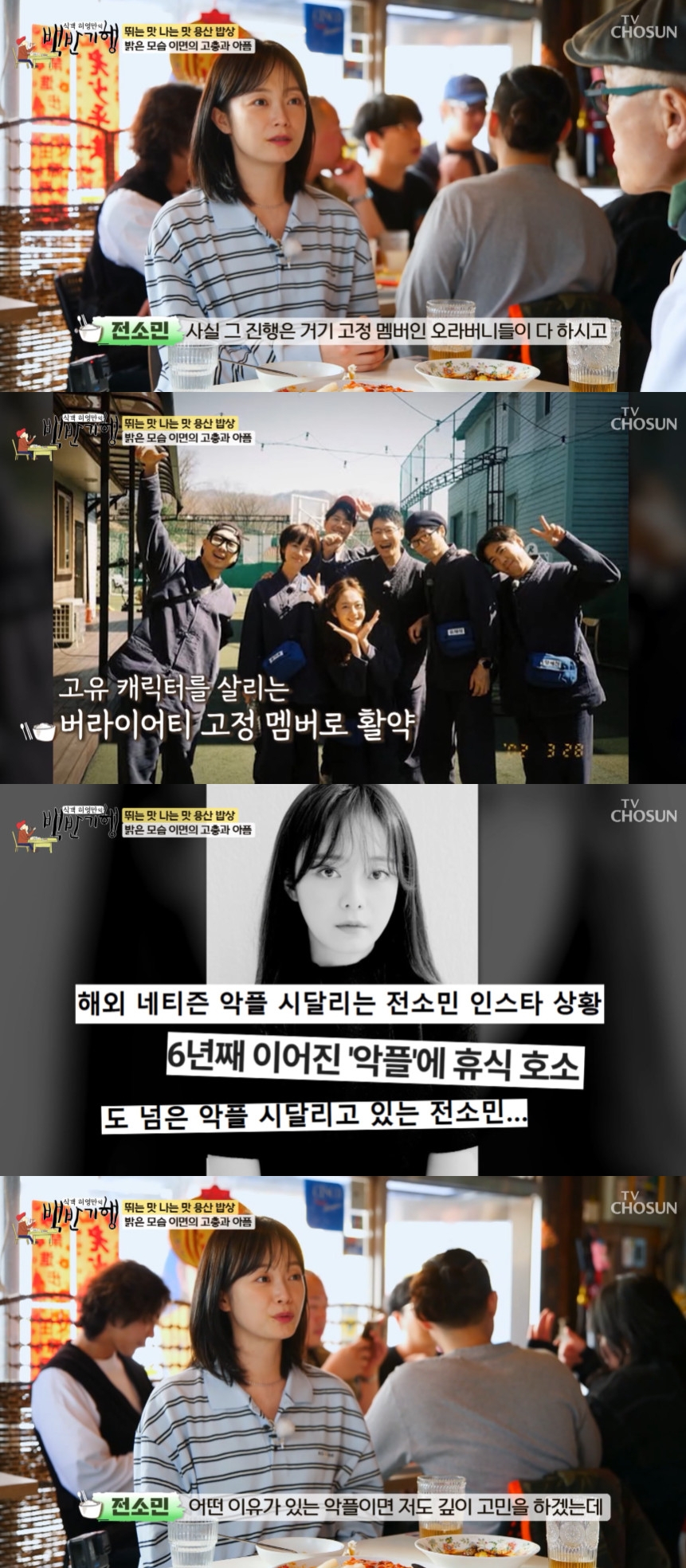 [스타뉴스|김나연기자]사진=TVCHOSUN식객허영만의백반기행배우전소민이악플고충을토로했다.11일오후방송된TVCHOSUN'식객허영만의백반기행'(이하'백반기행')에서는배우전소민을따라서울의중심용산으로맛기행을떠났다.전소민은"이동네산지8년정도됐다.독립을용산으로해서그때부터못떠나고계속지내고있다"며"성공한기분이들것같아서남산타워보이는곳에살고싶었다"고밝혔다.연예계데뷔22년차에접어든전소민은"전원래가수가되고싶었다.노래를잘못한다.다시태어난다면가수를꼭해보고싶다"고말해눈길을끌었다.이어'런닝맨'출연에대해서는"제가게스트로두번정도출연했다가고정멤버제안을받고7년정도출연했다.진행은오빠들이다하시고,버라이어티프로그램이다보니까고유의캐릭터로게임하고,예능적인플레이를하는건데저한테는진짜행복한직장이었다"고말했다.전소민은악플고충을토로하며"많은사람에게주목받을수록상처받을일들이많다.이유가있는악플이면깊이고민하겠지만제가느낄때이유가없는것같다.앞으로더의지되는사람을굳건히,견고하게만들려면빨리결혼도하면좋겠다는생각도한다"고덧붙였다.김나연기자[email protected]©스타뉴스&starnewskorea.com,무단전재및재배포금지