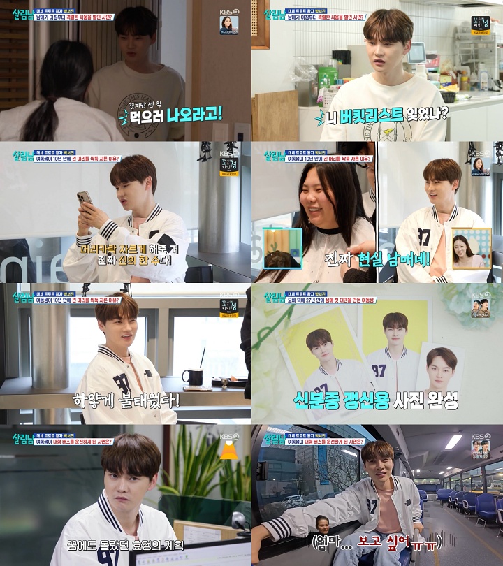 "삼천포애순이!!"iMBC연예뉴스사진박서진이무해한웃음을선사했다.10일방송된KBS2TV'살림하는남자들시즌2'(이하'살림남')에서박서진이동생박효정과의물오른티키타카로재미와훈훈함을동시에잡았다.이날박서진은박효정이새로운도전들을할수있도록자극하며또하나의무해한에피소드를만들어냈다.박서진은앞서적었던2025년버킷리스트를언급하며'단발머리로커트하기'를박효정에게제안했다."마음을다져준다생각하고단발로변신하자"고권유한박서진은미용실까지동행하며동생에게용기를줬다.이어10년만의단발을앞두고걱정하는박효정에게"머리카락을만져보니까많은아픔이느껴진다"는말과함께엉뚱한상황극을펼치며현실남매다운유쾌한케미도잊지않았다.박효정은최근까지도기부를이어온오빠박서진처럼기부를결심,어린이암환자를위한머리카락나눔에참여하며따뜻한마음을드러냈다.'삼천포애순이'를외치며박효정의머리를직접자른박서진은단발로변신한박효정에게긴머리가나은것같다는장난과함께개구진입담을보여줬다.뿐만아니라박효정은버킷리스트에있던'여권만들기'까지완성하며또하나의도전을이뤄냈다.또한'자격증따기'라는목표도실현하기위해운전학원을찾은박효정은1종운전면허를위한버스실습운전도경험했다.갑작스러운버스동승에당황한박서진은능숙하게운전대를잡고점차여유를찾아가는박효정과달리시종일관긴장감에사로잡힌모습을보이며마지막까지에피소드를웃음으로가득채웠다.박서진남매의도전,성장그리고이들이만들어내는무해한매력은매에피소드마다다음을기대하고응원하게만들고있다.이번에도박서진은특유의입담과유머러스한면모들로시청자들의마음을사로잡았다.매순간현실감넘치는남매의케미는일상속즐거움을배가시키며긍정에너지를더하고있다.따스함과유쾌함을모두담아내며특별한공감과웃음을선사하는박서진.꾸밈없는일상과친근함으로'살림남'의활력소로자리매김한박서진의활약은앞으로도계속될예정이다.한편,KBS2TV'살림남'은매주토요일오후9시20분에방송된다.iMBC연예백아영|사진출처KBSCopyright©MBC연예.무단전재및재배포,AI학습금지.