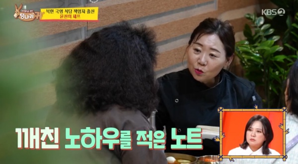사장님귀는당나귀귀/사진=KBS2캡처[스포츠투데이정예원기자]'사당귀'윤선희셰프가남다른요리실력을자랑했다.11일방송된KBS2예능'사장님귀는당나귀귀'(이하'사당귀')에는북한국영식당책임자출신윤선희셰프가출연했다.사장님귀는당나귀귀/사진=KBS2캡처이날이순실은윤셰프의식당에방문해평양냉면과어복쟁반을맛봤다.이들은"한국의평양냉면집은북한에서먹던것과맛이다른것이아쉬웠는데,이건정말그맛이난다"고감탄했다.윤셰프는"오늘도이어복쟁반을40개팔았다"며"월매출은시즌마다다르지만성수기여름기준하루매출1200만원,봄과가을은800만원,겨울은300만원정도나온다"고밝혔다.이어"그동안여러프랜차이즈에서일하며얻은노하우등을정리한노트가있다"며그간의노력을드러내기도했다.[스포츠투데이정예원기자[email protected]]Copyright©스포츠투데이.무단전재및재배포금지.