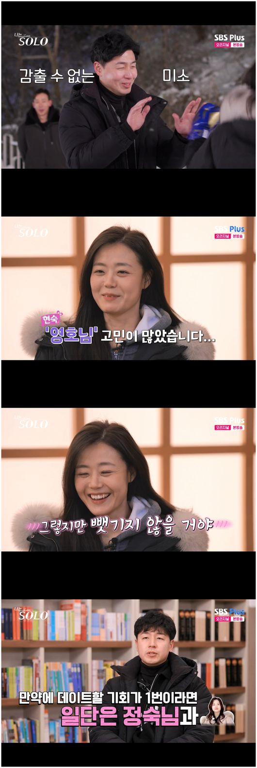 [OSEN=오세진기자]‘나는솔로’현숙의우아한외모와사려깊은태도에많은남성출연자가홀딱반했다.7일방영된SBS예능‘나는솔로’(이하‘나는솔로’)에서는첫날술자리를갖는미혼남녀의모습이그려졌다.옥순은멀찍이서광수의부대찌개를건너건너전했다.현숙은우아한외모로이미첫인상선택에서3~4표를획득한상황에,조용히광수의요리를거들었다.칼질은서툴러도설거지를하면서그를도왔다.이에영수와광수모두현숙의인품에반했다.정작현숙은“이곳에올때기대한점한가지,이곳에제마음에드는사람이있길바랐다.그사람이날안좋아하더라도,내가그분을마음껏좋아하고,설득하는과정도그리고싶었다.저는정말제가좋아야좋아하는스타일이다”라며흐뭇한미소를지었다.그의선택은여성선택1위인영호였다.광수는“현숙님은거의확신이있었다.시간을가질때되게신기하게보는현숙을보고확신했다.그래서확신이무조건있었다.저혼자만의생각이지만배신감?햄썰어주지말지,자리만들어주지말지,왜그랬을까,그런생각이들었다”라며아쉬움을토로했다./[email protected][사진]SBS예능‘나는솔로’방송화면캡처Copyright©OSEN.무단전재및재배포금지.