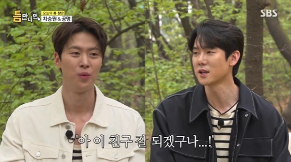 '틈만나면,'6일방송SBS'틈만나면,'캡처SBS'틈만나면,'캡처(서울=뉴스1)박하나기자=배우유연석,공명이첫만남을공개했다.6일오후에방송된SBS예능프로그램'틈만나면,'시즌3에서는차승원과공명이첫게스트로청담에서함께했다.공명이유재석과'런닝맨'출연이후6년만의만남이라고밝히며인사를나눈가운데,공명과유연석의첫만남이공개됐다.공명과유연석은10여년전,토이(유희열)와성시경이함께부른'세사람'의뮤직비디오주인공으로처음만났다고밝혔다.유연석은"딱찍을때부터이친구잘되겠다싶었다"라고당시를회상했다.이에공명이"그때제주도에서촬영했는데,아직도기억난다,보말미역국을사주셨다"라며"처음선배님이그렇게챙겨서사주시니까,감사해서엄청잘먹은기억이있다"라고덧붙였다.한편SBS'틈만나면,'은일상속마주하는잠깐의틈새시간사이에행운을선물하는'틈새공략'버라이어티프로그램으로매주화요일오후9시에방송된다[email protected]©뉴스1.Allrightsreserved.무단전재및재배포,AI학습이용금지.