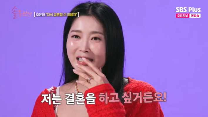 [스타뉴스|김정주기자]/사진=SBSPlus·E채널예능'솔로라서'방송화면배우오윤아가결혼과출산에대한강한의지를드러냈다.6일방송된SBSPlus·E채널예능'솔로라서'에서는오윤아가'절친'백지영을만나결혼에대한속깊은얘기를터놓는모습이그려졌다.이날오윤아는자신의힐링공간인네일숍에서백지영을만나네일케어를받으며수다삼매경에빠졌다.백지영은최근딸하임이와함께여행을다녀왔다고말문을였었고,오윤아는"언니보면딸낳고싶다.어떻게그렇게말이잘통하냐"고부러운모습을보였다.오윤아는제작진과의인터뷰에서"지영언니가너무부럽다.하임이가너무친구같더라.저는사실민이랑대화를많이해보지못해서아쉬웠다.아이랑대화하는기분이어떨까하는생각이들었다.그런기분을되게느껴보고싶다"라고털어놨다./사진=SBSPlus·E채널예능'솔로라서'방송화면이에백지영은"남자친구가생기면애를바로가지라"라고조언했고,오윤아는"저는사실그럴마음이크다.그건옛날처럼흉이아닌것같다"라고답해놀라움을안겼다.백지영은"너는만약에남자친구가생기면솔로생활을청산할거냐"라고물었고,오윤아는"당연하다.나는딱기다리고있다"고밝혔다.오윤아는"저는결혼을하고싶다.이혼한지가너무오래됐다.평범하게살때누릴수있는소소한행복이있는데제가오랫동안그런행복을못느끼고사니까결핍이찾아오더라.좋은분계시면언제든지결혼할생각이다.만약에아기가생긴다면욕하지말아달라"고당부하며수줍은웃음을터뜨렸다.이에황정음은"나도딸을낳고싶다"며오윤아의마음에공감했다.김정주기자[email protected]©스타뉴스&starnewskorea.com,무단전재및재배포금지