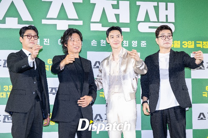 [Dispatch=이아진인턴기자]"영화보시고나서,'저소주한번마셔보고싶다'하는마음이드셨으면좋겠어요."(이제훈)'짠!'하고싶은영화가극장가에나온다.한국인의술,소주를소재로삼은영화'소주전쟁'이다.국민소주회사를두고,삼키려는자와지키려는자가대립한다.유해진과이제훈이주인공으로나섰다.유해진이회사에평생헌신한캐릭터로등장한다.이제훈은비상한두뇌를가진투자사직원으로변신한다.두사람의브로케미도관전포인트가될전망이다.'소주전쟁'측이24일서울강남구메가박스코엑스에서제작보고회를열었다.유해진,이제훈,손현주,최영준이참석했다.감독자리는공석으로진행했다.'소주전쟁'은IMF로자금난에처한소주회사'국보소주'를두고펼쳐지는이야기다.재무이사'표종록'(유해진분)은회사를지키려하고,글로벌투자사직원'최인범'(이제훈분)은매각하려한다.유해진이'표종록'을연기했다.그는365일회사를위해일한다.유해진은"술을좋아해서그런지,시나리오가술술읽혔다.표종록의인간적인면도좋았다"며웃었다.그는음주연기의달인이었다.유해진은"술을맛있게먹는건어렵지않았다"며"영화에서신상소주를소개하는멘트처럼'부드럽고프레쉬하게'마시려고노력했다"고말해웃음을안겼다.이제훈은그런유해진에존경심을표했다."표종록의인생이국보소주인것처럼,선배님의인생은영화이지않냐"라며"선배님이다양한연기를하실때마다감탄했다"고칭찬했다.이제훈은'최인범'역을맡았다.최인범은성과만쫓는글로벌투자회사의직원이다.국보소주를뺏으려는속내를감추고,표종록에게접근한다.캐릭터와높은싱크로율을자랑했다.최인범의엠비티아이가'ENTJ'인데,실제이제훈은'ENTP'인것."(최인범이라는)인물자체가낯설지않았다"고회상했다.JTBC'협상의기술'에이어,또다시스마트한전략가로변신한다.이제훈은"겉보기엔비슷해도결이다르다.최인범이좀더감정을드러내는성격"이라고짚었다.쟁쟁한선배들사이에서,똑부러지게연기했다.상황판단부터상대배우와의호흡까지능숙하게계산했다.최영준은이제훈을향해"어린베테랑"이라고치켜세웠다.유해진과이제훈의브로맨스를주목할만하다.처음엔비즈니스상대로서미묘한관계를보인다.사건이진행되며,둘의관계는우정으로발전한다.그매개체역시,소주다.유해진은"초반에는인범이종록이라는인물을전혀이해하지못한다.그렇지만소주를먹으면서더욱가까워지게된다"고설명했다.이어"변화하는두주인공의관계성이영화에어떻게담겼을지궁금하다"며"이제훈이워낙잘하는친구라,(완성본에)큰걱정이없다"고애정을표현했다.이제훈도"저는유해진선배님을보며배우의꿈을키운사람"이라며"선배님이현장에서많은자극을주셔서,저도발맞춰새로운모습을이끌어낼수있었다"고화답했다.이날'소주전쟁'은감독없이보고회를진행했다.원래,'소주전쟁'은신인최윤진의입봉작.그러나제작사'더램프'의결정에따라,최윤진은감독에서해촉돼'현장연출'크레딧을받았다.더램프와최윤진은현재법정에서분쟁중이다.더램프측은"최윤진은자신이'소주전쟁'(기존모럴해저드)의진정한원저작자인것처럼제작사를기망했다"고꼬집었다.최윤진은부당해고라고반발하고있다."제작사가크레딧조율문제를각본탈취로둔갑시켰다"며"현장연출이라는크레딧은부당하다"고밝혔다.법원에'감독계약해지효력정지가처분'도신청했다.MC박경림은"법적판단을기다리고있는부분이있다.현시점에선제작진과배우들이구체적답변드리지못하는점양해부탁드린다"며"추후답변자리를마련하겠다"고전했다.한편'소주전쟁'은오는6월3일개봉한다.<글=이아진인턴기자(Dispatch),사진=이승훈기자>Copyright©디스패치.무단전재및재배포금지.