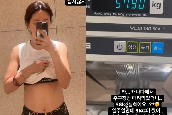 안선영소셜미디어[뉴스엔이해정기자]방송인안선영이다이어트를선언했다.안선영은4월21일개인소셜미디어계정을통해헬스장을찾은근황을공개했다.이어몸무게57.88kg이찍힌체중계사진을게시하며"와캐나다에서주구장창때려먹었더니58kg실화예요?일주일만에3kg이쪘어.다시뺄시간입니다"라는글을남겼다.또다른영상에는안선영이상의를든채뱃살을공개하는모습이담겼다.안선영은"사라진식스팩제가한달안에다시찾아와볼게요.먹는쪽쪽찌는나이갱년기다이어트쉽지않다"고고충을토로했다.그러면서"감자튀김,햄버거,맥주,라면,주구장창이런걸일주일내내먹었으니몸이이렇게안예쁘게배둘레로만와서들러붙었다"면서"먹는것이곧나자신"이라고반성했다.한편안선영은지난2013년3살연하사업가와결혼해슬하에1남을두고있다.앞서안선영은'사돈끼리','차달래부인의사랑','다시뜨거워지고싶은애로부부'등에출연했다.뉴스엔이해정haejung@기사제보및보도자료[email protected]ⓒ뉴스엔.무단전재&재배포금지Copyright©뉴스엔.무단전재및재배포금지.