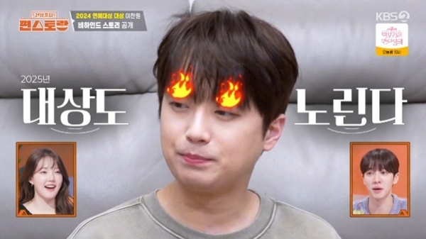 '신상출시편스토랑'18일방송KBS2TV'신상출시편스토랑'캡처(서울=뉴스1)박하나기자=가수이찬원이'신상출시편스토랑'에서대상수상비화를전했다.지난18일오후에방송된KBS2TV예능프로그램'신상출시편스토랑'(이하'편스토랑')에서는편셰프이찬원의'2024KBS연예대상'비화가공개됐다.이날이찬원은김장기부를함께했던절친트로트가수김중연,황윤성을초대해보양식추어탕만들기에도전했다.앞서이찬원은지난'2024KBS연예대상'에서남자단독최연소대상을거머쥐며화제를모았다.이찬원은대상트로피가부모님이계시는대구본가에있다며"부모님이뿌듯해하신다"라고전했다.이어이찬원은수상당시,회식장소에도착할때쯤휴대전화를열었더니800개의축하메시지가도착했다고밝혀모두를놀라게했다.답장을한이후,다음날에는900개의메시지가더와있었다고.이찬원은그중가장감격스러웠던메시지로아나운서출신방송인김성주의메시지를꼽았다.이찬원은"(김성주가)처음방송활동할때제롤모델이었다"라며김성주와주고받은메시지를공개했다.더불어이찬원은"작년에대상받았다,올해도받아야죠"라며연예대상2연패를목표로밝혀앞으로의활약에기대감을더했다.한편,KBS2TV'신상출시편스토랑'은미식가스타들의'먹고사는일상'을관찰하고그들의레시피를함께공유하는프로그램으로매주금요일오후8시30분에방송된다.KBS2TV'신상출시편스토랑'캡처[email protected]©뉴스1.Allrightsreserved.무단전재및재배포,AI학습이용금지.