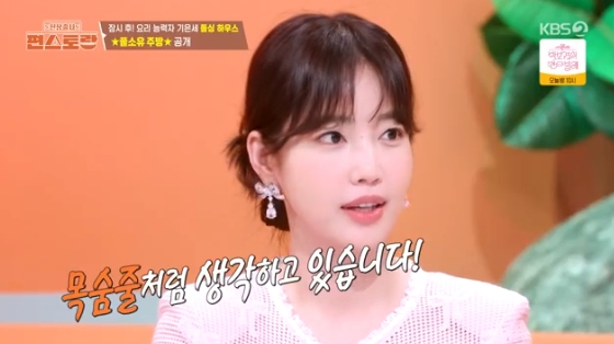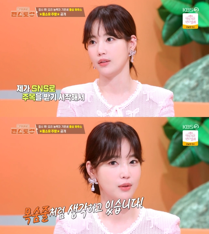 ‘신상출시편스토랑’.사진IKBS2‘신상출시편스토랑’방송캡처배우기은세가SNS로활발히소통중인근황을전했다.18일방송된KBS2‘신상출시편스토랑’에서는새로운편셰프로합류한기은세의모습이그려졌다.이날기은세는“배우이자인플루언서로활동중인기은세다”라고소개해눈길을끌었다.기은세는활발한SNS소통에대해“내가SNS로다시주목을받기시작해서목숨줄처럼생각하고열심히하고있다”고너스레를떨었다.SNS를통해파인다이닝못지않은요리실력을자랑한기은세.이에정호영은“예전에기은세의요리를맛본적있다.진짜보통이아니다”라고칭찬했다.예린역시“기은세가요리를예쁘게한다”고덧붙였다.한편‘신상출시편스토랑’은매주금요일오후8시30분방송된다.[이세빈스타투데이객원기자]Copyright©스타투데이.무단전재,재배포및AI학습이용금지
