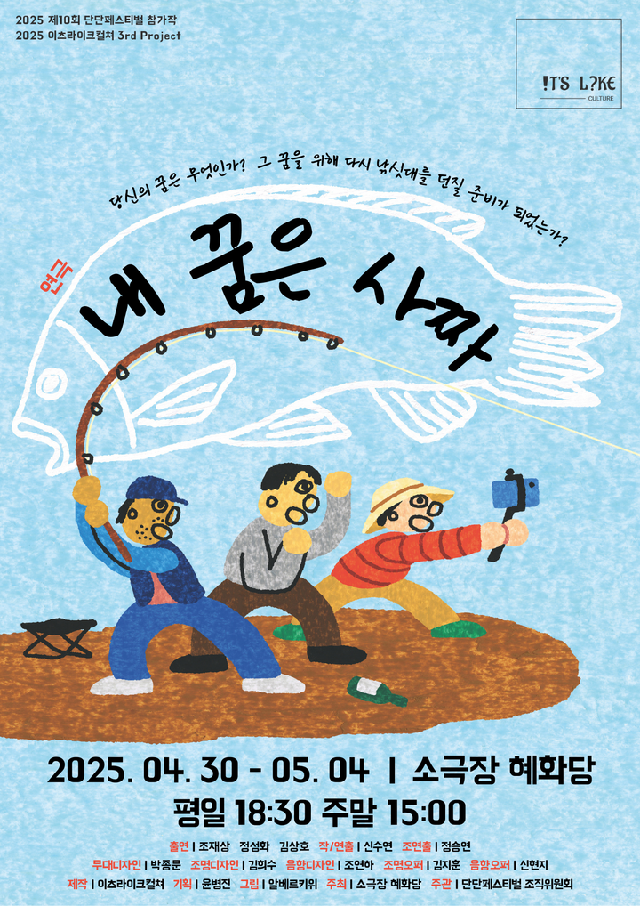 (MHN스포츠윤지원기자)현실과유머를담은단막극'내꿈은사짜'가대학로무대에오른다.문화예술프로덕션이츠라이크컬쳐는오는30일부터5월4일까지서울종로구소극장혜화당에서열리는제10회단단페스티벌에창작초연작'내꿈은사짜'를선보인다고지난13일밝혔다.이번작품은한적한낚시터를배경으로인간의야망과현실사이의간극을유쾌하면서도따뜻하게풀어낸단막극이다.특히'내꿈은사짜'는이츠라이크컬쳐가지난제9회SF연극제에서우수작으로선정된이후처음공개하는신작으로,SF장르적실험을넘어보다현실적인공간과상황속에서밀도있는서사를전개할예정이다.연출과극작을맡은신수연대표는"단막극의제한된시간안에서웃음과함께깊은사유를담아내는것이목표"라고밝히며,단막극특유의간결함과강렬함을통해관객에게깊은인상을남기고자한다고덧붙였다.출연진으로는조재상(철수역),정성화(준호역),김상호(민수역)이출연하며,각자의뚜렷한개성을살린무대앙상블로극의몰입도를높일예정이다.단단페스티벌은매년봄대학로소극장혜화당에서개최되며,단막극이라는형식을통해공연예술본연의감동과메시지를회복하는데중점을두고있다.이츠라이크컬쳐는이번공연을통해단막극이지닌짧지만강렬한매력을관객과공유하며깊은교감을나눌계획이다.사진제공=이츠라이크컬쳐Copyright©MHN.무단전재및재배포금지.
