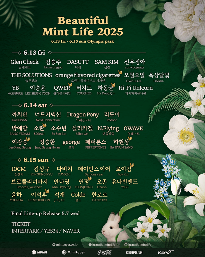 [OSEN=박소영기자]‘뷰티풀민트라이프2025(BeautifulMintLife2025,이하뷰민라)’가‘로이킴’,‘하현상,’‘소란’,‘QWER(큐더블유이알)’,‘이석훈’등9팀이추가된3차라인업을공개했다.이번3차라인업발표에는일자별라인업과스테이지별출연진정보도공개되며관객들의기대감을더욱고조시키고있다.뷰민라의시그니처무대인'민트브리즈스테이지'와'카페블로썸하우스','러빙포레스트가든'등각스테이지별아티스트가공개되면서페스티벌을기다리는팬들의뜨거운반응을이끌어내고있다.페스티벌의첫날인6월13일에는일본도쿄와오사카에이어타이베이에서열린첫단독팬콘서트까지전석매진을기록하며'글로벌최애걸밴드'로떠오르고있는‘QWER(큐더블유이알)'이합류소식을전했으며,이병헌주연의영화‘승부’의컬래버레이션음원을깜짝발표하며전통음원강자로서의건재함을보여준‘하동균’,감성적인영어가사와미니멀한사운드로해외에서도주목받고있는4인조인디밴드‘orangeflavoredcigarettes(오렌지플레이버드시가렛)’도함께이름을올렸다.6월14일에는일곱번째싱글<고양이>발매소식과함께단독팬미팅개최를예고하며음원과공연등모든분야에서활발하게활동하고있는‘하현상’,최근신곡‘너의등장’발매를기념해한강에서게릴라버스킹을진행하며‘라이브강자’의명성을입증한‘소란’,프로듀서‘드레스’와의합작앨범<우리가어른이된건거짓말같아>를발표하며올봄리스너들의감성을자극한‘이강승’이합류해관객들의기대를한몸에받고있다.6월15일에는신곡‘있는모습그대로’를발표하며새로운콘셉트와사운드로성공적인복귀를알린봄의대명사‘로이킴’을필두로그룹‘SG워너비’의멤버이자뮤지컬배우로활동영역을넓혀가며탄탄한필모그래피를쌓아가고있는보컬리스트‘이석훈’,뛰어난기타실력과매력적인보이스로무서운성장세를보이고있는싱어송라이터‘연정’이출연하며더욱화려해진라인업을완성시켰다.주최사인민트페이퍼는“올해는한층확장된스케일에걸맞게더욱풍성하고특별한공연을선보일예정”이란설명과함께“대표콘텐츠인민트문화체육센터를비롯해다양한부가이벤트와프로그램을통해뷰민라만의독특한정서를관객들에게깊이있게전달할것”이라고전했다.이어“사람들의추억속에서가장아름다운3일을선사하기위해최선을다하고있으며,곧순차적으로공개될다양한콘텐츠에도많은기대를부탁드린다”고덧붙였다.한편올해‘뷰민라’에는이승윤’,‘다비치’,‘정승환’,‘실리카겔’,‘10CM(십센치)’,‘터치드’,‘선우정아’,‘N.flying(엔플라잉)’,‘유다빈밴드’,‘SAMKIM(샘킴)’,’적재’,‘THESOLUTIONS(솔루션스)’등으로구성된1차라인업에이어‘YB(윤도현밴드)’,‘김성규’,‘윤하’,‘옥상달빛’,‘방예담’,‘페퍼톤스’,‘리도어’등이출연한다./[email protected][사진]제공Copyright©OSEN.무단전재및재배포금지.