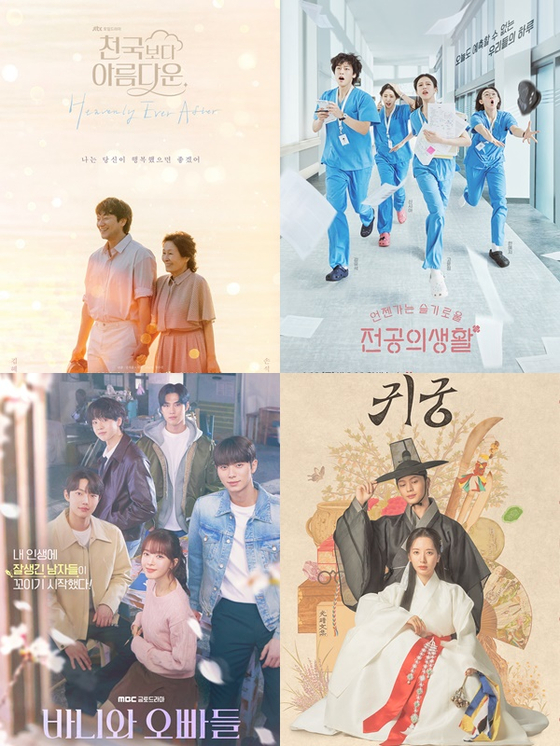 각드라마포스터.각방송사가일제히실험적인주제를내세운주말극신작을선보여안방극장시청률경쟁이더욱뜨거워질전망이다.새로운주말방송가대진표는토일극인JTBC'천국보다아름다운',tvN'언젠가는슬기로울전공의생활'과금토극인SBS'귀궁',MBC'바니와오빠들'이채웠다.최근윤석열대통령탄핵중계방송등의영향으로일부편성이바뀌면서공교롭게도해당드라마들이비슷한시기에첫방송을하게됐다.JTBC'천국보다아름다운'스틸18일과19일나란히첫선을보이는'귀궁'과'천국보다아름다운'은방송막바지준비에한창이다.같은판타지장르이지만,'천국보다아름다운'은천국을배경으로하는노부부의사랑이야기,'귀궁'은사극로맨스를저마다관전포인트로내세웠다.'천국보다아름다운'의최대강점으로는단연주인공인배우김혜자가꼽힌다.드라마는올해84세인김혜자가손석구와42세차이를뛰어넘고부부호흡을맞춰일찌감치시청자들의호기심을끌어왔다.그는80세의모습으로천국에도착해30대의젊은모습으로돌아간남편손석구와재회하며벌어지는이야기를그린다.드라마를통해김혜자는손석구와의부부로맨스뿐아니라,낯선천국에서적응하는과정을통해코믹한모습도소화한다.죽음이후의이야기를통해삶에관련한다양한메시지를전하면서감동도선사할전망이다.2019년백상예술대상TV부문대상을김혜자에안긴'눈이부시게'의김석윤감독과이남규,김수진작가가의기투합해'웰메이드드라마'가될것이란기대가벌써부터높은상태다.SBS'귀궁'육성재.'귀궁'은그룹비투비육성재와우주소녀보나(김지연)이주연을맡아'배우돌조합'으로눈길을끌고있다.육성재,보나가각각조선시대이무기와무녀역을맡아왕가에원한을품은'팔척귀'와대결하는내용을그린다.주연배우들이해외에서인지도가높은K팝그룹멤버출신인데다'K드라마'인기소재인판타지사극이어서해외성과에이목이집중된다.국내시청자사이에서는전작'보물섬'이15.4%의최고시청률을기록해그후광을받을수있을지가호기심대상으로떠오르고있다.10일오후서울신도림라마다호텔에서tvN새토일드라마'언젠가는슬기로울전공의생활'제작발표회가열렸다.신원호크리에이터,이만수감독,배우고윤정,신시아,강유석,한예지,정준원이참석했다.박세완엔터뉴스팀기자[email protected]두드라마보다한주앞선11일과12일에먼저공개된MBC'바니와오빠들',tvN'언젠가는슬기로울전공의생활'(언슬전)은청춘들의성장과사랑이야기를소재로해팬덤형성에박차를가하고있다.'언슬전'은2020년3월부터2021년9월까지방송하며신드롬급인기를모았던'슬기로운의사생활'시리즈의스핀오프드라마다.기존에는대학병원교수들의이야기가담겼다면,이번에는레지던트1년차들의적응및성장과정에초점을맞춰한층더젊은분위기로재단장했다.주연으로배우고윤정,신시아,강유석,한예지,정준원등안방극장신인들을대거기용하면서'파격캐스팅'이란반응도얻었다.'슬기로운의사생활'주인공인조정석,전미도,정경호등이특별출연하는등전작과연결고리가풍부해기존팬덤의지지를얻으면서4%대의시청률로출발했다.3일오후서울용산CGV아이파크몰점에서MBC새금토드라마'바니와오빠들'제작발표회가열렸다.김지훈연출,배우노정의,이채민,조준영이참석했다.박세완엔터뉴스팀기자[email protected]'바니와오빠들'은아예대학캠퍼스로배경을옮겼다.동명의인기웹툰을원작으로해대학생들의엇갈리는러브라인을다채롭게그리면서요즘좀처럼보기드문'캠퍼스로맨스'를선보이고있다.아역스타출신인노정의가중심을잡고,이채민,조준영등신인배우들이포진됐다.톡톡튀고섬세한로맨스이야기로해외에서먼저반응이나오고있다.일본OTT유넥스트2위,북미,중남미중심의OTT코코와플러스글로벌차트2위등에올랐다.유지혜엔터뉴스팀기자[email protected]사진=각방송사제공Copyright©JTBC.무단전재및재배포금지.