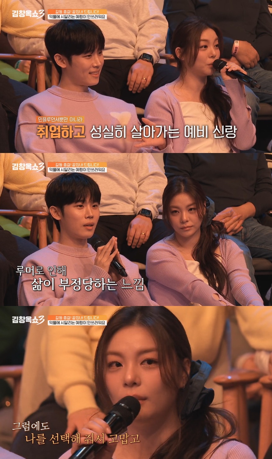 [서울=뉴시스]15일오후방송된tvNSTORY'김창옥쇼3'에는가수에일리,최시훈예비부부가출연해결혼발표후악성댓글로상처를입었다고말했다.(사진=tvNSTORY제공)[email protected]*재판매및DB금지[서울=뉴시스]강주희기자=소통전문가김창옥이알츠하이머검사후쏟아졌던가짜뉴스와악성댓글을언급했다.15일오후방송된tvN스토리(STORY)'김창옥쇼3'에는가수에일리,최시훈예비부부가출연해결혼발표후악성댓글로상처를입었다고말했다.과거넷플릭스연애프로그램'솔로지옥'에출연했던최시훈은"'솔로지옥'에나갔다가루머가생기면서여태살아왔던인생이부정당하니까너무싫었다.전진짜열심히사는데속상하다"고토로했다.에일리는"(결혼발표후에)남편이미디어에자주노출되다보니저희를비교한다거나루머를만들어내서뿌린다.거기에(남편이)상처를많이받는다"며미안한마음을드러냈다.이에김창옥은"내강연에도악플이달린다.'주둥이만까시네'같은내용도있다"며"그걸계속보고자꾸생각하면그악플만확대되어서보인다.날지지하고응원하는선플은안보이더라"고말했다.이어2년전알츠하이머검사를받았다며"다음날내가알츠하이머라고기사가났더라.그다음에는은퇴한다고하니'안녕하세요'라고인사하던사람들이'오래사세요.건강이최고'라고하더라"고자신의경험담을공개했다.김창옥은"그계기로나는모든사람에게호감이길바라나,안좋은말을듣는게힘드니까'이일이나한테안맞나'라고의심하게됐다"며"누군가에게평가받기힘들고맨날오디션보는것같았다"고토로했다.그러면서"제로앞에서악플같은말을하는사람은없다.아침안개처럼사라질말들"이라며"실체가없이글자의대부분은허상이다.제주도의가짜방지턱처럼주의할필요는있으나겁먹을필요는없으니시간이지나면삶으로증명될것"이라고조언했다.☞공감언론뉴시스[email protected]©뉴시스.무단전재및재배포금지.