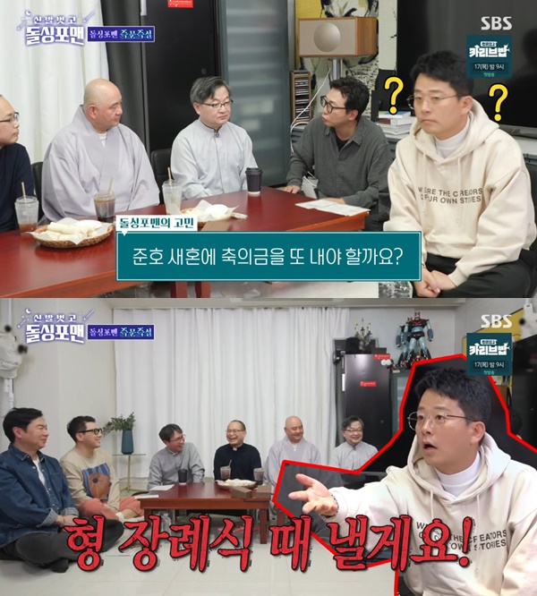 신발벗고돌싱포맨/사진=SBS캡처[스포츠투데이정예원기자]'돌싱포맨'김준호가'두번째축의금'질문에대해분노했다.15일방송된SBS예능'신발벗고돌싱포맨'에는목사,교무,신부,스님이출연하는성직자특집으로꾸며졌다.이날MC탁재훈은성직자들에게"김준호가7월'새혼'을한다"고말문을열었다.그는새혼의의미를모르는성직자들을향해"새로장가를간다는뜻이다.요즘은재혼대신새혼이라고부른다"고설명했다.이어"축의금을이번에또내야하는지질문하고싶다"고말해웃음을자아냈다.김준호는"그게질문이냐"며황당한표정을지었다.이에이상민이"이번에내는건못돌려받을수도있는거아니냐"고거들자,그는울컥하며"형장례식때낼테니걱정하지말라"고응수했다.[스포츠투데이정예원기자[email protected]]Copyright©스포츠투데이.무단전재및재배포금지.