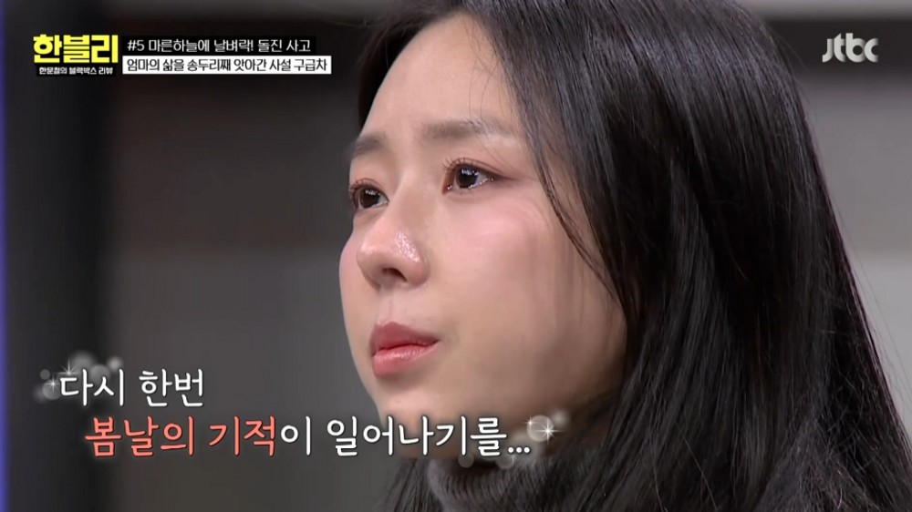 [TV리포트=양원모기자]예원이안타까운교통사고사연에분노했다.15일저녁JTBC'한문철의블랙박스리뷰'에서는교차로에서발생한충격적인교통사고사연이공개됐다.지난달8일한교차로에서사이렌을켠채신호를무시하고달려오던사설구급차가직진중이던차량과충돌하는사고가발생했다.문제는구급차가사고직후인도위를걷던보행자를치는2차사고를일으켰다는것.피해보행자가족은제작진과의만남에서"구급차가환자도없이사이렌을켜고신호위반까지했다"고사고경위를밝혔다.피해자딸은"병원에가보니엄마가온몸에붕대를감고있었다.손도발도다붕대로감겨만질곳이없었다"며"의사에게'눈뜰가능성이0%'라고들었다"며눈물을흘렸다.그러나가해자의태도는뜻밖이었다.졸음운전을주장하며"블랙박스메모리카드도고장났고,책임보험밖에없다"며병원비조차부담하지않고있다는것.피해자딸은"왜(1차사고때)브레이크를안밟았는지모르겠다.그때브레이크를밟았다면결과가달라졌을것"이라며"사고이후우연히엄마가계부를보게됐다.무엇하나자기를위해쓴게없더라.크게돈쓴게우리들옷사준것뿐이었다"라며말을잇지못했다.사연을접한패널들은분노했다.한해는"강력한처벌이필요하다"고목소리높였고,예원은황당한표정속눈시울을붉혔다.한문철변호사는"아무리구급차라고해도무턱대고다닐수있는건아니다.모든게있을수없는일"이라며"피해자가족이'실낱같은희망'이라고했는데,이를다른말로표현하면기적"이라며위로의말을전했다.한편,이날방송에서는비보호좌회전사고도소개됐다.비보호좌회전을시도하는차량과빠른속도로질주하는차량이정면으로충돌하는상황이담긴블박영상이공개된것.패널들은처음에비보호좌회전차량의과실을주장하다직진차량이시속141㎞의과속을했다는사실을듣고과실비율을두고논쟁을벌였다.한변호사는비슷한판례를들어분석하며"비보호좌회전은특히주의를기울여야한다"고당부했다.'한문철의블랙박스리뷰'는충격적인블랙박스영상을통해교통안전불감증에경각심을일깨우는프로그램이다.매주화요일밤8시50분JTBC에서방송된다.양원모기자[email protected]/사진=JTBC'한문철의블랙박스리뷰'방송캡처Copyright©TV리포트.무단전재및재배포금지