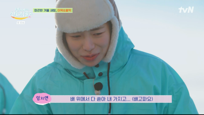 [OSEN=박근희기자]'언니네산지직송2’임지연이생각보다더힘든뱃멀미에고통을호소했다.13일첫방송된tvN'언니네산지직송2'에서는염정아,박준면,임지연,이재욱네남매의만남과함께첫번째산지강원도고성으로향하는여정이펼쳐졌다.새롭게합류한임지연은박준면과염정아를먼저만나기로했다.제일처음으로도착한임지연은박준면과먼저만나인사를나눴다.낯가림이많은박준면과달리임지연은본인은낯가림이없음을밝히며반갑게인사를나눴다.앞서임지연은제작진과의인터뷰에서밥을얼마나먹느냐는질문에“그런걸세어보지않아요.얼마나먹을수있을지를체크해본적이없다”라고밝혔다.이후2월강원도에서사남매는새벽4시에한사무실에집합했다.엄청난크기의배를타게된사남매는영하20도의추위와뱃멀미로넋을놓고힘들어했다.특히막내즈인이재욱과임지연이정신을못차릴정도로괴로워했다.조업을마친후사남매는어묵을먹으며몸을녹였다.임지연은“생각보다더추웠다”라며고된하루였음을밝혔다.이재욱은“나중에는콧물을닦다가안닦았어”라고말했고,임지연역시“나도.콧물이여기얼어있었어”라며공감했다./[email protected][사진]‘언니네산지직송2'방송화면캡쳐Copyright©OSEN.무단전재및재배포금지.