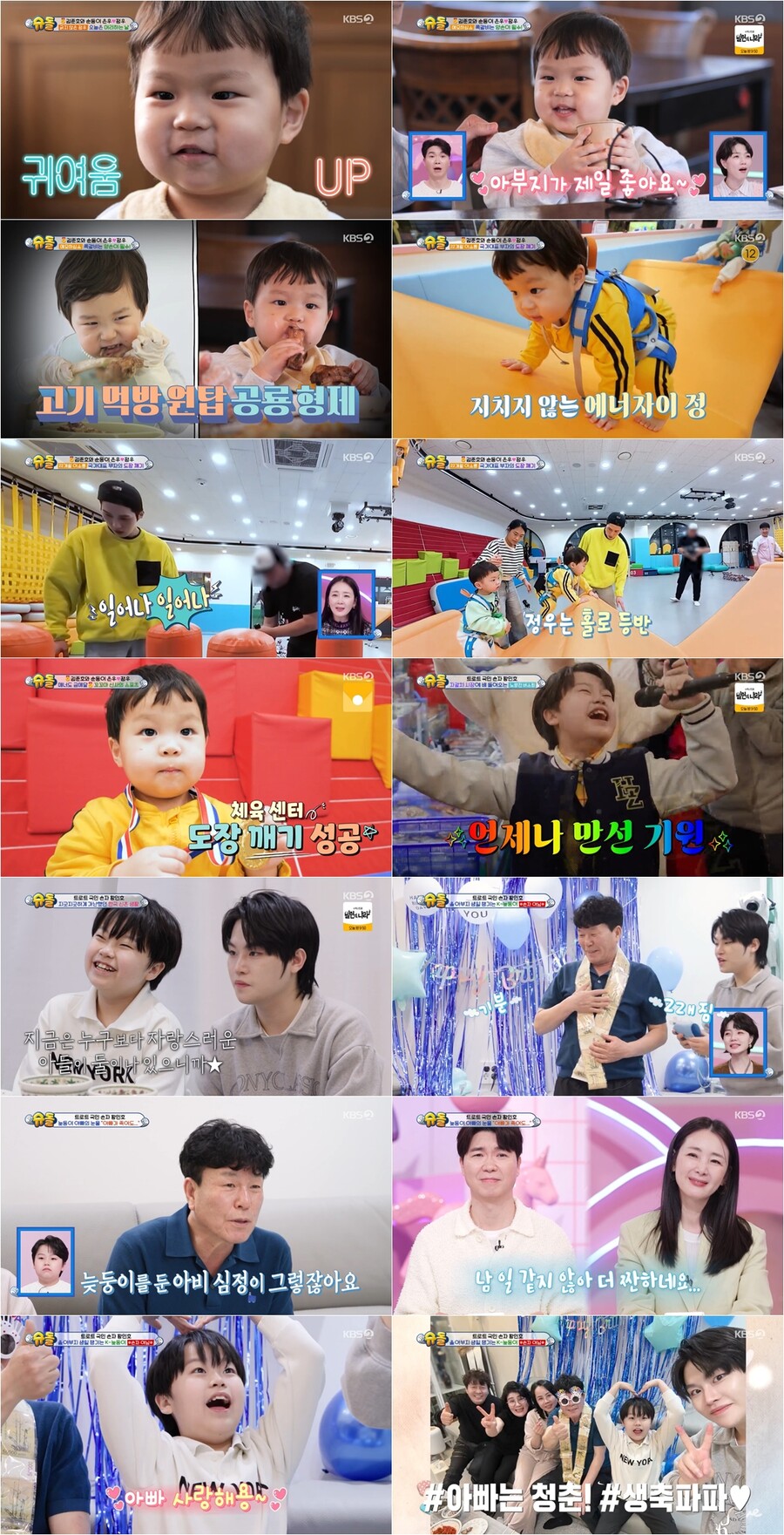 ▲슈돌정우.제공ㅣKBS[스포티비뉴스=강효진기자]KBS2‘슈퍼맨이돌아왔다’의정우가22개월만에폭발적인어휘력성장과함께애교만땅수다쟁이의모습으로시청자를사로잡았다.지난9일방송된KBS2TV‘슈퍼맨이돌아왔다’568회시청률은전국3.6%,최고5.3%기록하며시청률쾌조를이어갔다.(닐슨코리아기준)KBS2‘슈돌’568회는‘나에게넌기적이야’편으로3MC박수홍,최지우,안영미와김준호,황민호가함께했다.김준호는둘째아들정우와시간을보내며정우의폭풍성장을체감했고,황민호X황민우형제는아버지를위해특별한생신파티를준비해훈훈함을안겼다.특히정우는폭발적으로늘어난어휘력과표현력으로이목을집중시켰다.고깃집에서정우는“사장님!빨리주세요”라며완벽한문장을구사한후주문을받으러온사장님을귀엽게올려다보더니“고기빨리주세요”라며앙증맞은표정과애교가득한말투로주문을마쳐심쿵을유발했다.또한어두워진상황을“동굴이다너무깜깜해”라고표현한데이어“식었어식었어”,“탄건나쁜거야”등일취월장한언어능력을뽐내는정우의모습에절로감탄이터져나왔다.최지우는“정우가재잘재잘수다쟁이가됐다”며귀여워했고,아빠김준호역시“우리정우말이너무늘었어”라며정우의폭풍성장에놀라워했다.“마딛떠마딛떠”를연발하며야무진양손갈비먹방으로귀여움을폭발시킨정우는“이제갈까?”라는아빠의말에“아니야”라며더먹겠다는의사를밝혔다.이어“안뇽”이라며쿨하게아빠를먼저보내웃음을자아냈다.김준호가“원하는만큼먹어아빠기다려줄게”라고말하자정우는“아빠최고!”라며아빠의서운함을사르르녹게만들며아빠를들었다놨다해웃음을선사했다.언어능력뿐만아니라국대DNA를타고난신체능력과나날이다정해지는정우의모습이랜선이모,삼촌들의마음을빼앗았다.체육센터도장깨기에나선정우는고난이도인장애물5단코스달리기에서1등을하며금메달을거머쥐었다.경쟁자인친구를배려하고“괜찮아”,“고마워”등은우와판박이말투로대화를하는정우의모습이흐뭇함을자아냈다.또한수많은운동중펜싱을향한일편단심을보여준정우는포크를펜싱칼처럼들고마르쉐자세를취해절로미소를짓게만들었다.이날황민호는형황민우와아버지생신파티를준비했다.황민호,황민우가사온싱싱한해산물과광주에서온고모가만든남도식반찬,그리고갈비찜,잡채,베트남식볶음요리까지아빠맞춤형생일상이차려져눈길을끌었다.황민호X황민우는100만원용돈케이크로통큰효도플렉스를했고,가수를꿈꿨던아버지와함께흥겨운합동공연까지펼쳐어깨를들썩이게했다.처음에는생일파티를안하겠다고했던황민호아빠는“생일챙겨주니기분이좋네”라고진심을전했다.늦둥이황민호아빠는“나이앞에는장사가없더라”라며늦둥이아들이보여주는성장과비교해점점나이들어가는부정을안타까워해눈시울을붉혔다.이에늦둥이부모인박수홍과최지우도“남일같지않다”라고공감을표하며울컥하는마음을드러냈다.황민호는“아빠가항상건강하고우리곁에계셨으면좋겠다”라고아빠에대한애틋한진심을표현해뭉클함을자아냈다.KBS2‘슈퍼맨이돌아왔다’는매주수요일오후8시30분에방송된다.<저작권자ⓒSPOTVNEWS.무단전재및재배포금지>Copyright©스포티비뉴스.무단전재및재배포금지.