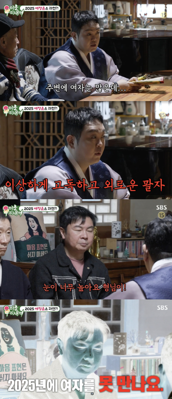 [스타뉴스|정은채기자]/사진='미운우리새끼'방송화면캡쳐'미운우리새끼'에서배우겸무속인이건주가임원희의새해연애운을점쳤다.19일방송된SBS예능프로그램'미운우리새끼'에서는무당이된'순돌이'이건주에게연애운을보는임원희와정석용의모습이그려졌다.이날임원희와정석용은임현식의팔순을맞아그의집에찾았다.임현식과함께드라마'한지붕세가족'에서부자관계로호흡을맞췄던배우겸무속인이건주역시자리를함께했다.이건주는임원희의연애운을점치며"형님이마음만먹으면결혼을할수있다.이상하게여자는많다.그런데이상하리만큼고독하고외로운팔자다"라며"그이유가눈이너무높다"라고설명했다.그러면서"어떤여자를만났을때바라는게너무많다.지적인여자를좋아한다"라고지적했다.이에임원희는수긍하며"제가공부를안해서상대적으로지적인여자를좋아한다"라고털어놨다.2025년연애운을묻는임원희의질문에는이건주는냉정하게"여자를못만난다"라고밝혀임원희를절망케했다.정은채기자[email protected]©스타뉴스&starnewskorea.com,무단전재및재배포금지