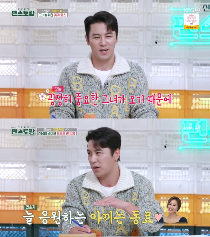 ‘신상출시편스토랑’.사진IKBS2‘신상출시편스토랑’방송캡처가수장민호가김양과의친분을드러냈다.7일방송된KBS2‘신상출시편스토랑’(이하‘편스토랑’)에서는장민호의일상이그려졌다.이날장민호는의문의여성과통화를해눈길을끌었다.의문의여성은장민호를“오빠”라고불러‘편스토랑’패널들의이목을집중시켰다.장민호는“네가보내준걸로맛있게해줘야겠다.얼른와라”라고말했다.이를본이연복이“솔직히말해라.여자친구아니냐”고묻자장민호는말없이미소지었다.장민호는꽃게를손질한후청소까지깔끔하게했다.장민호는“오늘굉장히중요한그녀가온다”고해기대감을높였다.이후김양이장민호의집을찾았다.장민호는“나와김양은14년지기다.김양본명이김대진인데나는‘대진아’라고부른다.활동을많이했는데경연에서성적을잘못내서”라고말했다.한편‘신상출시편스토랑’은매주금요일오후8시30분방송된다.[이세빈스타투데이객원기자]Copyright©스타투데이.무단전재,재배포및AI학습이용금지