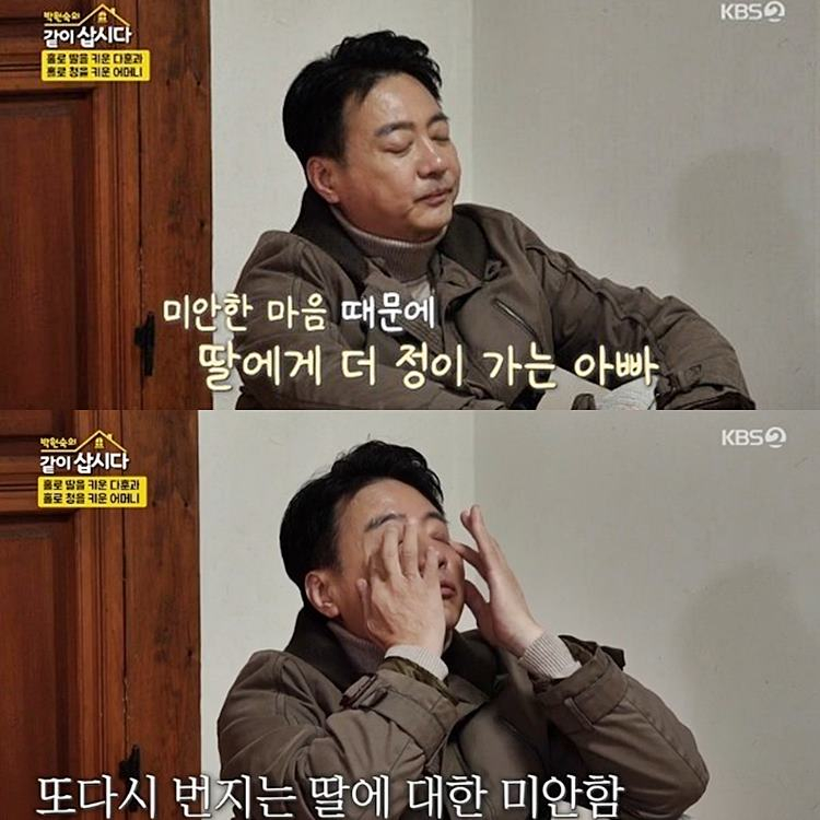 사진=‘박원숙의같이삽시다시즌3’방송캡처.배우윤다훈이딸에게미안함이크다며눈물을흘렸다.20일방송된KBS2예능프로그램‘박원숙의같이삽시다시즌3’(이하‘같이삽시다’)에서는김청,윤다훈이박원숙,혜은이와함께했다.이들은전통이살아숨쉬는양반마을로유명한인량리전통마을로떠났다.윤다훈은군대휴가나와서만난인연으로딸이생겼다고고백했다.그는“부모님은‘네자식이니까우리가키워주는게당연하다’고하셨지만나때문에힘드셨겠다는것을(이제야)알겠더라.요샌어딜가도부모님생각이난다”고말했다.그러면서딸에게도미안한마음을고백했다.그는“우리딸이할머니가그러셨다더라.‘학교에서아빠이야기하지말라’고,가족끼리어디가게돼도‘할머니옆으로오라’고했다더라”면서“그게속상하고미안하다”고털어놨다.현재딸은결혼까지해어엿한부모가돼있다고.윤다훈은“손녀가딸보다예쁘다는말이사실이냐?”는물음에“난딸에게아빠로서어렸을때(미안함)그런게있어서그런지딸이더예쁘고미안하다”며울컥했다.김지혜기자[email protected]©일간스포츠.무단전재및재배포금지.