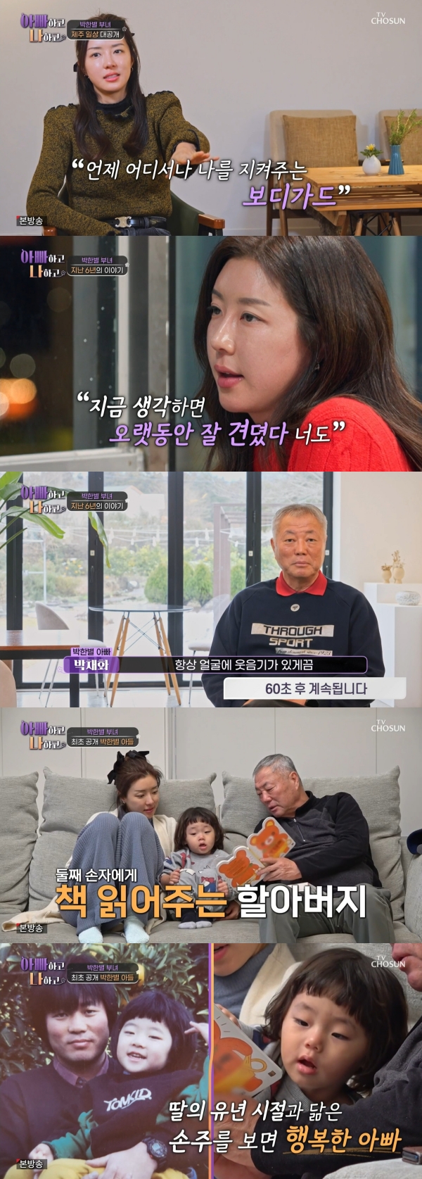 사진=TV조선[스포츠투데이김태형기자]박한별이자신과똑닮은둘째아들을공개했다.8일방송된TV조선'아빠하고나하고'에는박한별과부친의제주도일상이그려졌다.이날박한별은"저희아빠는되게든든한존재다.항상저를지켜주는보디가드"라고소개했다.아버지는"우리별이는어릴때어렵게임신해서하나낳은딸이다.잘자라준예쁜딸로눈에넣어도안아프다.지금도아기같다"며애정을드러냈다.박한별은남편의일로활동을중단했을때를떠올리며"죄송한일이다.남편의일이지만아내로서같이책임을느끼고,이렇게공백기가생긴것같다"고털어놨다.이어"제가제주도로이사를가고나서아빠까지같이오게됐다.아빠가힘이많이됐다"고말했다.아버지는"그게말이6년이지긴터널을빠져나온기분"이라며"오랫동안잘견뎠다.우리딸이항상웃음기만있는세월로잘살았으면좋겠다"는뜻을전했다.그런가하면박한별은둘째아들을최초공개했다.단발머리를한아들의귀여운외모가눈길을사로잡았다.아버지는"애교가많다.어릴때한별이와비슷하다"고말했다.이어어릴때박한별을안고있는아버지의옛날사진이공개됐다.박한별둘째아들과똑같은붕어빵외모였다.박한별은"나도순간아들사진인줄알았다"고반응했다.[스포츠투데이김태형기자[email protected]]Copyright©스포츠투데이.무단전재및재배포금지.