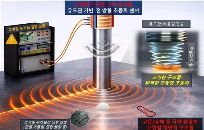 고온·유독가스현장도360도정밀검사…신호강도13.7배↑,실시간모니터링구현열기와유독가스로접근조차어려웠던산업현장의검사사각지대를해소할초음파센서기술이나왔다.센서를구조물에직접붙이지않고도전방향결함을정밀탐지할수있어원자력·플랜트등고위험시설의안전관리체계를바꿀수있을지주목된다.한국표준과학연구원(KRISS)은'유도관(Waveguide)'을적용해검사대상에센서를직접부착하지않고도360도전방향결함을탐지할수있는초음파센서를개발했다고밝혔다.이번기술은고온배관,유해화학물질저장고등극한환경구조물의실시간고속검사를가능하게해산업안전성을한층높일것으로기대된다.KRISS가개발한유도관기반전방향초음파센서모식도.연구진제공."붙이지않고도본다"…센서-구조물분리한원격탐상비파괴검사는구조물을손상시키지않고초음파신호로내부결함을찾는핵심안전기술이다.항공우주,원자력,대형플랜트등사고위험이큰산업현장에서필수적으로활용된다.문제는'설치'였다.기존초음파센서는검사대상표면에밀착해야해고온·부식성환경에서쉽게손상됐고,작업자접근이차단된구역은애초에센서부착이불가능했다.360도검사를위해여러센서를분절형으로이어붙이는방식도한계였다.파동을하나의신호로합치는과정에서간섭과왜곡이발생해정밀도가떨어졌다.KRISS비파괴측정그룹은매개체인'유도관'을도입해이구조적한계를풀었다.센서를구조물과떨어진안전지점에설치하고,유도관을통해초음파를전달하는방식이다.센서가극한환경에직접노출되지않으면서도,검사대상에는균일한파동을보낼수있다.KRISS비파괴측정그룹.왼쪽부터차례대로김승일근로UST연구학생,정주영근로학연연구학생,승홍민선임연구원,박찬욱박사후연구원,박춘수비파괴측정그룹장.KRISS제공'비틀림진동'으로전방향균일파동구현핵심은원통형유도관내부에서'비틀림진동'을발생시켜이를고르게정렬해전달하는기술이다.마치수건을비틀듯형성된진동을균일하게방사함으로써,센서를멀리떨어뜨려도전방향으로일정한전단(horizontal)파동을구현한다.실험결과,개발된센서는약95%의방향균일성을확보했다.신호강도는기존분절형방식대비13.7배이상향상됐다.넓은영역을빠르게스캔하면서도정밀영상화가가능한수준이다.유도관은다양한재질과형상으로설계할수있고,끝단을곡면구조물에맞춰절삭하는것도가능하다.복잡한배관,곡면탱크,수중구조물등다양한환경에유연하게적용할수있다는의미다."수중구조물까지정밀검사"…사고예방시스템즉시적용기대승홍민KRISS비파괴측정그룹선임연구원은"개발한센서는액체환경에서도신호성능이우수해물에잠긴대형구조물까지정밀검사할수있다"며"그동안탐상이어려웠던사각지대를정밀하게확인해대형재난사고예방에기여할수있을것"이라고말했다.이번기술은고가센서를여러개설치하는대신,비교적저렴한유도관구조의단일센서로넓은영역을검사할수있어비용절감효과도기대된다.실시간모니터링체계와결합할경우,극한환경시설의상시안전감시인프라로확장가능성도제기된다.한편이번연구는KRISS기본사업'시설물지능형모니터링의가용성혁신을위한디지털안전측정기술개발'의지원을받아수행됐으며,기계공학분야국제학술지'MechanicalSystemsandSignalProcessing(IF8.9)'에2025년12월1일자게재됐다.김종화기자[email protected]©아시아경제.무단전재및재배포금지.