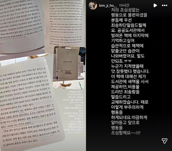 김지호,공공도서밑줄사과…“습관이나왔다”(출처:김지호인스타그램)배우김지호(52)가공공도서관에서대출한도서에밑줄을그은사실이알려지며논란이일었다.이에김지호는곧바로사과입장을밝혔다.최근김지호는SNS에독서감상을적은글과함께밑줄이그어진책사진을올렸다.그는"반납을미루고드디어읽어냈다"는글과함께책일부에밑줄이그어진사진과펜을든자신의모습을공개했다.그런데해당도서는공공도서관바코드가부착된김훈작가의소설집'저만치혼자서'였다.게시물이확산되면서도서관에서빌린책에임의로필기하는행위는공공재훼손에해당한다는비판이제기됐다.이에지난23일김지호는자신의SNS에"제조심성없는행동으로불편하셨을분들에게죄송하다는말씀을드린다"며사과했다.그는"공공도서관에서빌려온책마지막부분을기억하고싶어서제책에밑줄긋던습관이나와버렸다"며"누군가지적했을때'앗잘못했다'싶었다.이책에대해서는도서관에새책을사서제공하거나비용을드리거나,죄송함을말씀드리고교체하겠다"고밝혔다.그러면서"때로이런부주의한행동을하게된다.따끔하게알아듣고앞으로는행동을조심하겠다"고덧붙였다.한편김지호는1990년대드라마'사랑의인사','아파트','8월의신부'등에출연하며인기를얻었다.2001년배우김호진과결혼했으며,슬하에딸한명을두고있다.송미희기자bnt뉴스연예팀기사제보[email protected]©bnt뉴스.무단전재,재배포및AI데이터활용금지