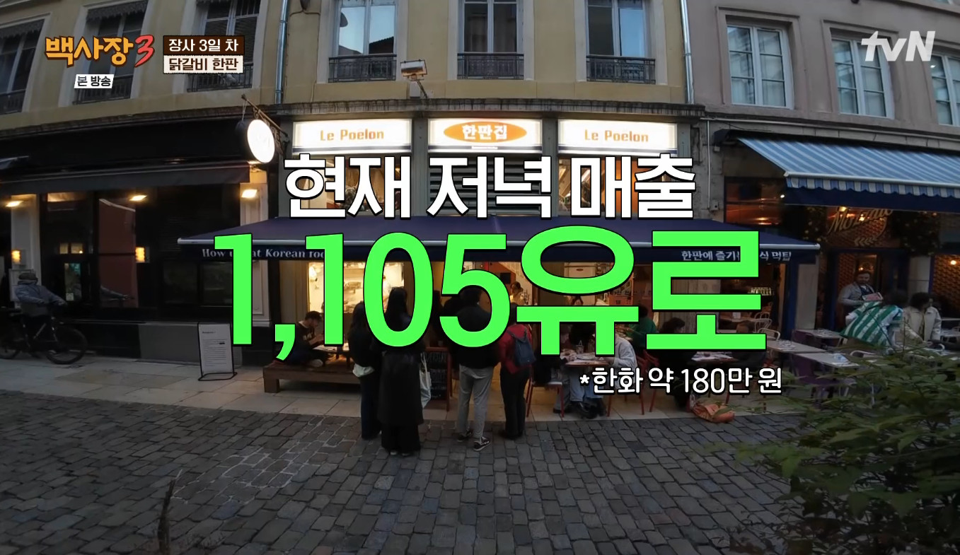 (엑스포츠뉴스황수연기자)위기메뉴였던닭갈비가간장닭갈비메뉴추가로역대최고매출을경신하는기록을썼다.24일방송된tvN'세계밥장사도전기:백사장3'(이하'백사장3)에서는미식의수도'로불리는프랑스리옹에서3일차영업에도전하는한판고깃집의모습이그려졌다.한판집의매출은1일차798유로에서2일차1005유로로올랐다.다섯가게중한가게를제치며4위가됐고,연매출10억달성은13%로올랐다.백종원은"할수있을거같은데?오늘도점심장사만하지만금요일이지않나.소주까지팔면주말에(목표금액달성을)끝낼것같다"며금요일오후부터주말이시작되는대목에기대를드러냈다.3일차의한판요리는닭갈비였다.이번에는2층매장도오픈하기로했다.손님이오기전닭갈비의슬픈사연도공개됐다.4일전테스트하던닭갈비를두고오븐에대량조리를시도했으나오븐이수도와연결되지않아고기가익기전양념이다타버린것.백종원은양념이타는걸막기위해국물이자작한닭갈비로메뉴변경을시도했다.낮12시영업이시작됐다.손님들은퐁듀처럼치즈에찍어먹는닭갈비에만족감을드러냈다.직원들은닭갈비의매운맛을잡아줄셀프주먹밥도소개했다.윤시윤과유리는서툰영어로우여곡절끝에설명을마쳤다.현타가온윤시윤은"구데기급영어로해냈다.쉴때영어나배우러다니자"라고다짐해웃음을자아냈다.한판집의디저트화전도좋은반응을얻었다.그러나주방밖을보던백종원은낮은회전율에심각한표정을지었다.대부분의손님들은메뉴를본뒤그냥지나치는경우가많았다.2층은두테이블밖에못받았다는홀담당존박의보고에백종원은작전실패를선언했다.백종원은"손님테이블에있는음식이매워보이는것같다.음식이세팅되면서부터손님이드문드문했다.어제삼겹살은테이블에음식이나가면서손님이들어오지않았나"라며고심끝에저녁장사부터'단짠'간장닭갈비메뉴를추가했다.간장닭갈비에손님들의걸음이멈추기시작했다.7시오픈소식에대기줄도길어졌다.백종원은바깥손님들이보는테라스에는간장닭갈비를내부손님에게는빨간닭갈비를추천하도록했다.손님을끌기위해서는야외손님의간장닭갈비메뉴가필요했다.오랜기다림끝에들어온팀을시작으로야외테이블의간장닭갈비가좋은반응을얻기시작했다.다른손님을불러모으는역할을하면서급기야장사1시간만에좌석을꽉채웠다.저녁1시간만에매출1105유로(한화180만원)을기록하며역대최대매출을갈아치웠다.장사가끝나갈무렵,지친존박은"이제방송같지도않다.그냥개고생하는다큐다.이게무슨예능이야"라고외쳤다.유리는"직업체험프로그램있지않냐.'체험삶의현장'같은것"이라고말해웃음을자아냈다.사진=tvN황수연기자[email protected]©엑스포츠뉴스.무단전재및재배포금지.