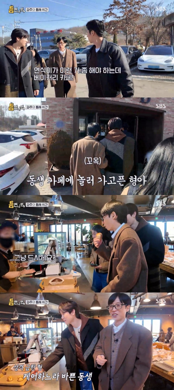 사진=SBS[스포츠투데이김태형기자]유연석이유재석을말렸다.24일방송된SBS'틈만나면,'에는라미란,주종혁이'틈친구'로출연했다.이날유재석,유연석,라미란,주종혁은파주의한베이커리카페를찾았다.유재석은유연석에게"연식이가이런거좀해야되는데"라며베이커리카페개업을제안했다.주종혁이"잘어울린다"라고거들자,유연석은"이렇게큰건할수없다"며웃었다.유재석이"형좀가게"라고하자,유연석은"형안올거지않나"라고말했다.유재석은"너하면갈게"라고약속했다.주종혁은"제가알바하겠다"고덧붙였다.각자메뉴를고른뒤,라미란이계산을하겠다고나섰다.유재석이"미란씨가…"라며어쩔줄몰라하자,라미란은"두번은안말리시네?"라고말해웃음을자아냈다.유재석은계산을마치자마자손으로빵을집더니한입먹으려했다.이모습을본점원은"그냥드시게요?"라고물었고,이에당황한유연석이"포장해주실거다"라며유재석을제지했다.머쓱해하는유재석의모습이웃음을자아냈다.[스포츠투데이김태형기자[email protected]]Copyright©스포츠투데이.무단전재및재배포금지.