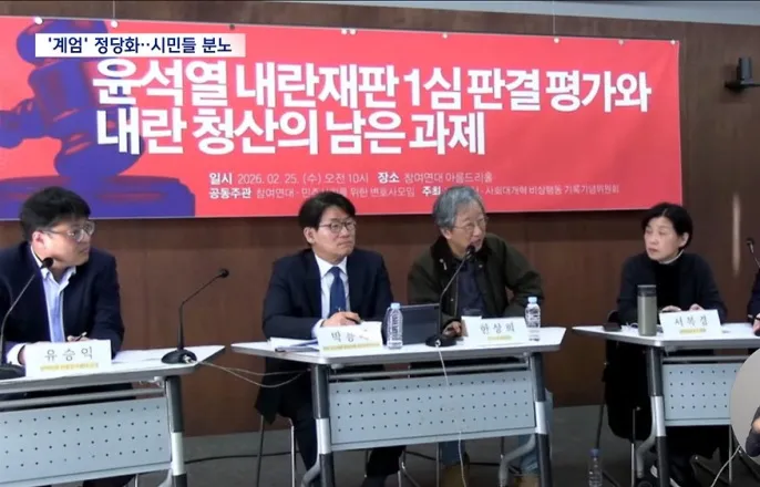[뉴스데스크]◀앵커▶윤석열전대통령에게무기징역을선고한1심판결을평가하기위한토론회가열렸습니다.참석자들은지귀연재판부가내란행위를'성경'읽는행위에빗대내란을미화했다고비판했습니다.강은기자입니다.◀리포트▶내란우두머리피고인윤석열에대한1심선고당시재판장은돌연성경을언급했습니다.[지귀연/재판장(지난19일)]"성경을읽는다는이유로촛불을훔칠수는없습니다."목적이수단을정당화할수없다는비유인데,이를두고내란동기를미화했다는성토가터져나왔습니다.윤석열내란일당이밝힌계엄이유중하나는'종북세력척결'.이를'성경읽는행위'에빗대국민을심각하게모독했다는겁니다.[김정환/변호사]"'법복입은귀족'이라는표현이괜히나온게아니고요.이분들이사회를보는인식자체에이미그일반인들과의괴리가존재하기때문에…"지귀연재판부는'비상계엄하에서할수없는행위를하려고했을때만내란이된다'는논리를폈습니다.계엄선포는심사대상이아니고,국회침탈만잘못이라는취지인데,내란책임을축소시켰다는비판도제기됐습니다.[서복경/'더가능연구소'대표]"시도자체가위헌·불법했기때문에내란인겁니다.그런데교묘한논리를가지고이자체가위헌·불법한계엄선포였다라는부분을아예잘라내버리는겁니다."법정최고형이아닌무기징역으로감경한사유는모두가중처벌사유로,전면재검토해야한다는지적도나왔습니다.국가존립을위태롭게한중범죄자는초범이라고봐줄수없고,헌정질서수호를요구받는공직을두루거쳤다면더무겁게평가받아야한다는겁니다.또시민저항덕분에실패했던계엄을두고윤석열일당의물리력자제때문이라고보는건어불성설이라고도했습니다.[한상희/교수/참여연대공동대표]"강도짓을하려했는데체력단련을안하는바람에피해자한테제압당했다그래서강도죄가아니다,뭐이런식입니다."참석자들은노상원수첩을증거로인정하지않은것도고의적으로배척한것으로보인다며항소심에서제대로단죄가이뤄져야한다고강조했습니다.MBC뉴스강은입니다.영상취재:정영진/영상편집:이소현MBC뉴스는24시간여러분의제보를기다립니다.▷전화02-784-4000▷이메일[email protected]▷카카오톡@mbc제보영상취재:정영진/영상편집:이소현강은기자([email protected])기사원문-https://imnews.imbc.com/replay/2026/nwdesk/article/6803245_37004.htmlCopyright©MBC&iMBC무단전재,재배포및이용(AI학습포함)금지