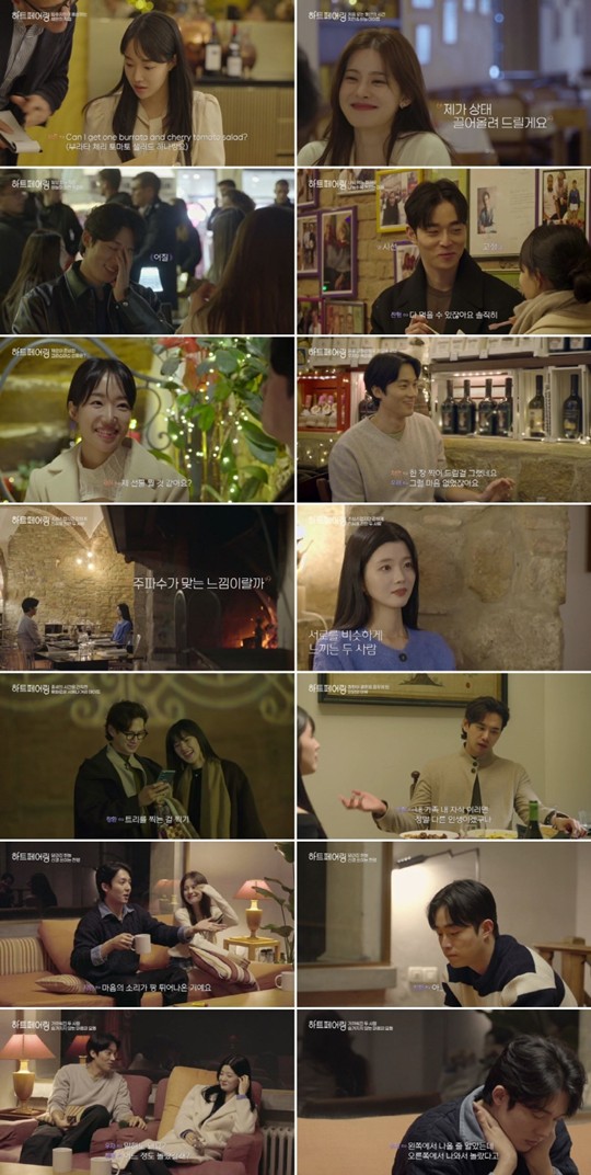 채널A‘하트페어링’에서하늘이‘확신의커플’이었던찬형에서지민으로노선을급변경해‘도파민한도초과’급어지러움을안겼다.28일방송한채널A연애프로그램‘하트페어링’4회에서는평생을함께할인연을찾아이탈리아의‘페어링하우스’를찾아온입주자7인우재-제연-지민-지원-찬형-창환-하늘에이어‘女메기’로채은이새롭게투입되면서,8인이이탈리아에서마지막1:1데이트를진행하는모습이담겼다.모두가자신의마음을표현하는데최선을다한결과,채은→찬형→하늘→지민→제연→우재로이어지는사상초유의‘6인사슬관계’가형성됐다.이렇게이탈리아에서의일정이드라마틱하게마무리된가운데,시청자들은다음주펼쳐질서울에서의2막에더욱큰기대감을드러내며향후펼쳐질8인의러브라인을추측하는재미에빠졌다.‘페어링하우스’의넷째날저녁,피렌체의레스토랑에‘女메기’채은이깜짝등장했다.단아하면서도세련된채은의모습에남자입주자들은관심을보였고,유창한영어로메뉴를주문하는채은의포스에입주자들은“전문직느낌이난다”며직업을추측했다.직후,채은이‘증권사경제연구소선임’이라는사실이스튜디오에공개됐다.묘한분위기에서식사를마친8인은‘페어링하우스’에돌아왔다.다음날아침,여자입주자들은남자들이두고간선물로마지막데이트상대고르기에나섰다.채은은‘찬형’이라고예측한산타머그컵,제연은‘우재’라고생각한필기구와엽서,하늘은아르노강액자,지원은토스카나그림타일을골라데이트준비에돌입했다.가장먼저지민과매칭된하늘의데이트가공개됐다.지민은“(하늘과)데이트를할거라는상상을못했다”며놀라워했고,하늘은“선물의주인공이지민인줄알고뽑았다”라고어필했다.이에지민은“제연도내가고른선물이무엇인지알았는데,일부러안뽑은것같다”며심란해했고,하늘은“내가상태를끌어올려주겠다”며“지금까지계속눈빛으로플러팅해왔다,나를‘여사친’으로만생각하지말라”고선포했다.이후로도하늘은“제연에게만호감을주지말고나도챙겨달라,질투나니까”라는등화끈한플러팅을몰아쳤다.하늘의속마음을처음알게된지민은“어지럽다”며혼란스러운속내를내비쳤다.하늘의기존페어링상대였던찬형은‘女메기’채은과데이트에나섰다.이들은채은의‘최애음식’인젤라또를먹으며달달한분위기를풍겼다.채은은“젤라또를진짜좋아한다”며해맑게웃거나,찬형의젤라또를뺏어먹는귀여운행동으로순식간에찬형을무장해제시켰다.이후로도두사람은캐나다에거주했다는공통점을비롯해모험적인음식취향,형제자매와의끈끈한유대감등을확인하며공감대를형성했다.대화내내찬형의‘찐웃음’이새어나오는모습에,윤종신은“찬형X하늘의대화에서는서로가애쓰는느낌이있었다면,찬형X채은의대화는물흐르듯자연스러워마치신혼부부같다”고새로운핑크빛촉을세웠다.제연은전날자신과의데이트를포기했던우재와재회했다.“내선물인줄알고골랐는지?”라는우재의질문에제연은“노코멘트”라고답하며사실상우재를택했음을알렸다.이후제연은우재에게직접고른‘그림’을선물해줬는데,이과정에서우재의직업이‘화가’라는사실이밝혀져“끊임없이사색하는모습이이해가된다”는평이나왔다.두사람은길거리에서서로의사진을찍어줬고,식사도중우재는“어제(데이트를포기한것을)반성많이했다”며조심스레입을열었다.직후우재는“우리의(내향적인)텐션이누군가에겐힘들수있는데,주파수가맞는느낌이라편안하다”라고호감을표현했다.이에제연도“처음대화할때부터비슷하다고느꼈다”고화답해쌍방호감임을확인시켜줬다.이들의긴장감넘치는대화를지켜보던5MC는“마치청춘영화한편을본듯한기분이다.두사람은그냥결혼했으면좋겠다”며과몰입했다.전날서로의페어링북을골랐다는사실을확인한‘운명페어링커플’창환X지원은“어제의대화가충분하지않았다”며한층친밀한데이트를했다.서로가기르는강아지와고양이를공통사로끊임없는대화를나눈가운데,창환은“아픈고양이를데려와건강하게키워내며특별한기쁨을느꼈다.강아지와고양이를키우는기분도이런데,가족과자식이생기면더욱상상하지못할기쁨이생길것같다”고결혼을꿈꾸게된계기를털어놨다.직후,지원의직업이공대출신의‘S전자반도체엔지니어’라는사실이밝혀져흥미를끌어올렸다.데이트를마친입주자들이하나둘‘페어링하우스’로돌아온가운데,지민X하늘은먼저도착해있던찬형X채은과만났다.이때감기기운이있던지민이부엌에서라면을끓이자,하늘은자신의핫팩을지민에게건넸고,라면을나눠먹으며지민을살뜰히챙겼다.또한하늘은찬형이보는앞에서도지민에게‘직진눈빛’과은근한스킨십을감행했다.이를본찬형의얼굴은굳어졌다.잠시후우재X제연이공용거실에나타나자지민또한불편함을감추지못했다.그는데이트후기를전하는두사람의친밀해진모습에결국눈을감은채고개를돌렸다.마지막으로창환X지원까지숙소로돌아오자,입주자8인은자신의심장을떨리게만든사람에게‘엽서’로마음을표현하는시간을갖게됐다.이와관련,윤종신은“이탈리아에서의마지막선택과엽서의내용은입주자들이서