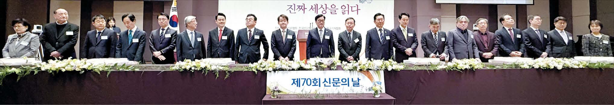 7일열린‘제70회신문의날’기념축하연참석자들.왼쪽부터허명한국여성단체협의회회장,김효재한국언론진흥재단이사장,손영신부산일보발행인,김여송광주일보발행인,이규연청와대홍보소통수석,이병규문화일보명예회장,장동혁국민의힘당대표,박종현한국기자협회회장,박장희한국신문협회회장(중앙일보발행인),우원식국회의장,이태규한국신문방송편집인협회회장,정청래더불어민주당당대표,오세훈서울시장,홍준호조선일보발행인,임채청동아일보발행인,방문신한국방송협회회장,이성철한국일보발행인,장승준매일경제발행인,정성은한국언론학회회장,최문선한국여성기자협회회장./한국신문협회한국신문협회와한국신문방송편집인협회,한국기자협회는7일서울중구한국프레스센터에서‘제70회신문의날기념대회’를개최했다.이날대회에선지난한해뛰어난보도활동으로신문발전과언론창달에기여한언론인에게주는‘한국신문상’시상식이열렸다.본지정철환기자가‘러시아-우크라이나전쟁파병북한군포로2명세계첫인터뷰’로뉴스취재보도부문에서수상했다.경인일보의‘납치살인피해자600장의SOS’(뉴스취재보도부문),한국경제의‘사라진청년들:캄보디아범죄조직을해부하다’,전북일보의‘지역소멸위기극복프로젝트청년이장이떴다!’(이상기획·탐사보도부문)가함께수상했다.본지이용필자산팀차장대우는각신문사의발전에힘쓴이들에게수여하는‘신문협회상’을받았다.Copyright©조선일보.무단전재및재배포금지.