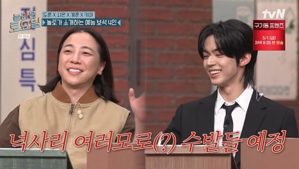 tvN‘놀라운토요일’캡처tvN‘놀라운토요일’캡처[뉴스엔유경상기자]넉살이도훈의바로옆자리에서굴욕을당했다.4월25일방송된tvN‘놀라운토요일’에서는놀토보석함특집으로투어스도훈,엔시티위시시온,킥플립계훈,키키키야가출연했다.투어스도훈은“혼자나와서떨리고.단체가익숙하다보니까.그래도잘해봐야죠”라고‘놀토’출연각오를밝혔다.도훈의긴장한모습에모두가박수를치며응원했다.피오는“얼굴이분량”이라며도훈의미모를칭찬했고,붐이“넉살이얼굴이큰편이아닌데바로옆자리라서”라며넉살과도훈의얼굴크기를비교해웃음을자아냈다.이어엔시티위시시온은“둘셋.안녕하세요.엔시티위시시온입니다.둘셋”이라고혼자인사를하면서도둘셋구호를붙여서웃음을더했다.태연이“혼자해도필요한거”라며시온을응원했고,모두가“입에밴거”라며시온을귀여워했다.뉴스엔유경상yooks@기사제보및보도자료[email protected]ⓒ뉴스엔.무단전재&재배포금지Copyright©뉴스엔.무단전재및재배포금지.