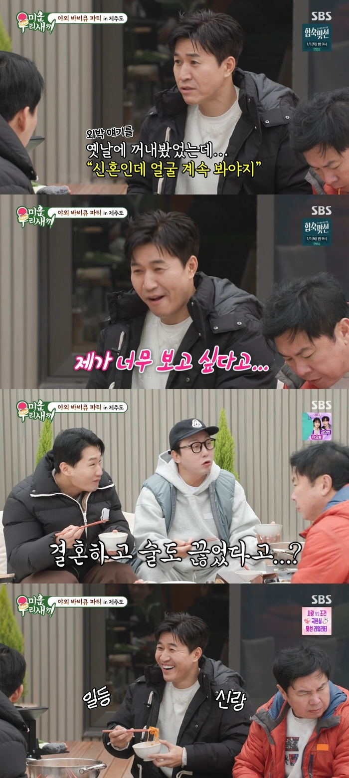 ‘미운우리새끼’사진|SBS김종민이결혼후삶이완전히달라졌다고밝혔다.21일오후방송된SBS예능프로그램‘미운우리새끼’(이하‘미우새’)에서탁재훈은제주도집에임원희,김종민,신규진을초대했다.이날방송에서김종민은몇시간후다시집에가야한다고했다.그는“외박이안된다.신혼인데계속얼굴봐야거아니냐고하더라.제가계속보고싶다고한다”며사랑꾼면모를보였다.신규진이“힘들어보인다.소주한잔드리냐”고묻자김종민은“술못마신다.결혼하면다그런것아니냐”며결혼후삶이완전히바뀌었다고말했다.또김종민은“비자금도걸렸다.김희철이말해서”라며아쉬움을표했다.‘미운우리새끼’는일요일오후9시5분SBS에서방송된다.[서예지스타투데이객원기자]Copyright©스타투데이.무단전재,재배포및AI학습이용금지