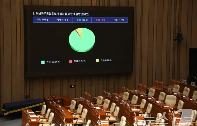 여야,대구·경북통합법법사위개최놓고공방…입장못좁혀국민투표법·전남·광주통합법·아동수당법처리…국힘은불참1일서울여의도국회에서열린제432회국회(임시회)제8차본회의에서전남광주통합특별시설치를위한특별법안(대안)이가결되고있다.2026.3.1ⓒ뉴스1신웅수기자(서울=뉴스1)조소영한상희금준혁홍유진기자=1일열린국회본회의에서전남·광주통합특별시설치를위한특별법안이더불어민주당주도로통과됐다.이외에도행정통합특례근거를담은지방자치법개정안을비롯해재외국민의국민투표권을보장하는국민투표법개정안,비수도권거주아동등에게월수당을최대2만원더지급하는내용의아동수당법개정안이모두처리됐다.여야,대구·경북통합법법사위개최놓고공방…입장못좁혀이날오후8시40분께열린본회의는민주당주도로27분만에속전속결로종료됐다.국민의힘은전날(2월28일)까지민주당의3대사법개혁안(법왜곡죄·재판소원·대법관증원)이본회의에서모두처리된점,대구·경북통합특별법에대한국회법제사법위원회개최를민주당이받아주지않은점등을들어이날본회의에불참했다.당초이날본회의는오후9시께열려국민의힘이앞서국민투표법개정안에건필리버스터(무제한토론)종결표결등이우선진행돼야했다.국민의힘은지난달24일부터자사주소각의무화를담은3차상법개정안을시작으로필리버스터를진행해왔다.그러나이날오후3시30분께국민의힘은대구·경북통합특별법처리를위한법사위개최를민주당에요청하며필리버스터전격중단을선언했다.이에당시필리버스터중이던김정재국민의힘의원은발언을중단했고,사회를보던이학영국회부의장은필리버스터종결을선포했다.곧바로국민투표법개정안표결에돌입해야했으나본회의장참석의원이적어이부의장은정회를선포했다.뒤이어여야모두긴급회의에돌입했다.다만'네탓공방'만벌어졌을뿐결과적으로서로의입장은좁혀지지않았다.민주당은국민의힘을향해법사위를열려면대구·경북통합특별법에대해당론을명확히정하는등단일안을가져와야한다고주문했다.또충남·대전통합에관해서도입장을정해야한다고했다.정청래민주당대표는페이스북을통해"대전·충남통합,대구·경북통합이무산되면200%국민의힘책임"이라며"대전·충남통합하자더니반대하고대구·경북통합은자기들끼리찬반으로나뉘어오락가락.님들의정체는도대체무엇이냐"고했다.한병도원내대표도국회에서기자들과만나"통합된의견을만들어오라"고지적했다.송언석국민의힘원내대표는이에페이스북에"급소를찔렸냐"며"핑계찾아삼만리하지말고대구·경북행정통합법통과시키면된다.처리하지않으면모두귀당(민주당)책임"이라고맞받았다.여야간입씨름은민주당이국민의힘의법사위개최요청을거부하고,전남·광주통합특별법등본회의상정법안나머지를모두처리하겠다고하면서사실상종료됐다.백승아민주당원내대변인은오후5시50분께서면브리핑을통해"오늘원칙에따라국민투표법,전남·광주통합특별법,지방자치법개정안,아동수당법개정안을모두처리하겠다"고했다.한병도더불어민주당원내대표(오른쪽)와송언석국민의힘원내대표가1일서울강남구코엑스에서열린제107주년3·1절기념식에서대화를나누고있다.2026.3.1ⓒ뉴스1이재명기자'與주도'국민투표법부터전남·광주통합법,아동수당법모두처리본회의속개후첫안건으로통과된국민투표법개정안에는재외국민참정권을보장하는내용이담겼다.2014년헌법재판소가국민투표공고일기준국내거소지를신고한재외국민만투표인명부에올리도록한국민투표법에대해헌법불합치결정을내린데따른것으로,본래2015년까지법개정을헌재가권고했으나국회는지금까지입법을미뤄왔다.국민투표법개정은오는6·3지방선거와함께'원포인트개헌'국민투표를시행할수있는선행조건으로도꼽혀주목됐다.중앙선거관리위원회가재외국민투표등의시스템을구축하려면선거일로부터약4개월전까지국민투표법이개정돼야하기때문이다.우의장은해당법통과후"국민참정권에대한입법공백상태가해소됐다"며"이제국가주요정책에관한국민투표가가능해졌다"고말했다.전남·광주통합특별법에는7월1일부터출범하는전남·광주통합특별시(약칭광주특별시)에서울특별시에준하는위상을부여하고재정지원은물론교육자치등각종특례를부여하는내용이담겼다.정부는4년간최대5조원씩총20조원에달하는재정지원을약속했다.6·3지방선거를통해서는초대전남·광주통합특별시장이선출될예정이다.천하람개혁신당원내대표는이와관련반대토론을통해해당법의목표에는동의하나"번갯불에콩볶아먹듯이상정됐다"고문제점을지적하기도했다.용혜인기본소득당대표또한찬성토론으로나섰으나민주당을향해"충분한숙의와의견수렴을거치겠다고했던약속은어디로갔나"라고말했다.뒤이어통합특별시체제의특수성을고려해각종특례의근거가규정된지방자치법개정안이통과됐다.마지막으로통과된아동수당법개정안은아동수당지급대상을현재8세미만에서13세미만으로2030년까지단계적으로확대하는것이주요내용이다.수도권거주아동은기존대로매월10만원을받지만비수도권이나인구감소지역거주아동에게는매월2만원범위내