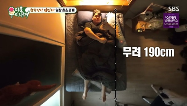 SBS‘미운우리새끼’SBS‘미운우리새끼’[뉴스엔유경상기자]천하장사김민재가초거대사이즈일상을공개했다.3월1일방송된SBS‘미운우리새끼’에서는‘피지컬아시아’우승자씨름선수김민재가합류했다.서장훈은김민재에대해“2026년강호동,이만기다.천하장사3번,백두장사14번,굉장히짧은기간안에해냈다”고극찬했다.이어공개된김민재의일상은침대끝으로발이삐쭉나와있는모습부터모두를놀라게했다.김민재의키는190cm로구단숙소에서생활중.김민재의옷은6XL초거대사이즈를자랑했고신발사이즈는310mm로신발장이제대로닫히지않았다.김민재가기상하자마자향한곳은훈련을가기전에아침식사를하는식당.김민재는식사를하다가“네가컵라면10개를먹었다며?”라는질문을받자“12개”라고정정했다.김민재가소속된씨름단은소고기회식비가2240만원이나와모두를놀라게하기도했다.소5마리를먹은거나다름없는비용.설날에열리는메이저대회상금은3천만원으로김민재는그동안상금을타서부모님집재건축,부모님차와가방,뱃일할때쓰는기계도사드렸다고말해효심으로감탄을자아냈다.(사진=SBS‘미운우리새끼’캡처)뉴스엔유경상yooks@기사제보및보도자료[email protected]ⓒ뉴스엔.무단전재&재배포금지Copyright©뉴스엔.무단전재및재배포금지.