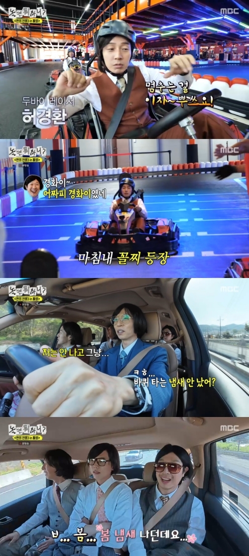 ‘놀면뭐하니’.사진IMBC허경환이요즘대세다운행보를보였다.25일오후방송된MBC예능프로그램‘놀면뭐하니?’(연출김진용장우성장효종왕종석,작가최혜정)에‘쩐의전쟁3in통영’편으로꾸며졌다.이날방송에서유재석,하하,주우재,양상국은허경환의고향인통영에방문했다.다섯사람은30만9천원을걸고레이싱내기에나섰고꼴찌허경환이내게됐다.식당으로이동하는중유재석은“바퀴타는냄새오랜만에맡았다”고말했다.하하도“벽에박을까봐불안했다”며공감하자허경환은“바퀴타는냄새가났었냐?나는안났다.봄냄새났다”고말해웃음을자아냈다.MBC‘놀면뭐하니?’는매주토요일오후6시30분방송된다.[서예지스타투데이객원기자]Copyright©스타투데이.무단전재,재배포및AI학습이용금지