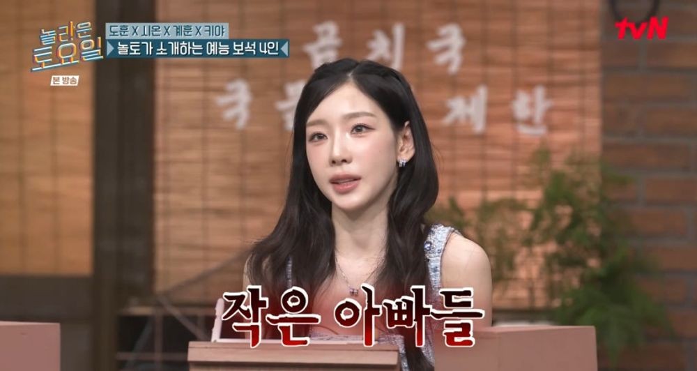 [TV리포트=이혜미기자]소녀시대태연이2010년생키키키야의등장에'나이굴욕'을당했다.무슨사연일까.25일tvN'놀라운토요일'에선도훈,시온,계훈,키야가게스트로출연해받아쓰기를함께했다.이날NCT시온이'둘셋'을외친후힘차게인사를한가운데태연은"혼자하는데도둘셋이필요한것"이라며너스레를떨었다.이에붐이"그건보통멤버들집중하라고하는거아닌가"라고짓궂게묻자태연은"둘셋이꼭있어야한다"고덧붙이며아이돌리더의고충을헤아렸다.이어키키의막내키야가출격해"키키의막내이자'놀토'의막내키야"라조자기소개를한가운데'놀토'출연자들은그의나이에주목했다.키야는2010년생으로14세의어린나이에키키의멤버가된터.이날그는"올해고등학교에입학을해서만으로15살이됐다"라는고백으로출연자들을놀라게했다.이에태연은넉살,영케이,피오등남성출연자들을가리키며"작은아빠들"로명명,큰웃음을자아냈다.조용히상황을지켜보던신동엽은태연을'고모'라고칭했으나키키는"예쁜사람은다언니니까태연언니다"라고일축해태연을웃게했다.이혜미기자/사진='놀토'방송화면캡처Copyright©TV리포트.무단전재및재배포금지