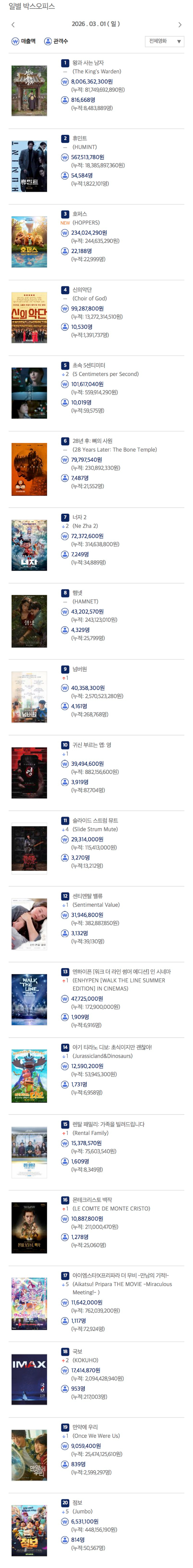 영화'왕과사는남자'가누적관객800만명을넘어선가운데3.1절하루에만81만명이관람한것으로집계됐다.일별박스오피스순위에따르면왕과사는남자는1일하루관람객만81만6600여명이넘었다.이에따라이날기준누적관람객이848만명에달했다.스크린업계는이달중순왕과사는남자의누적관객이1000만명을돌파할수있을것으로보고있다.온라인에서는"나도어제가족들이랑다같이봤다","하루에만81만명이라니1000만은기정사실","영화보고단종에대해알아보고영월가서청령포도다녀오고,이런거처음해봤다"등의댓글이이어졌다.김희정기자[email protected]©머니투데이&mt.co.kr.무단전재및재배포,AI학습이용금지.