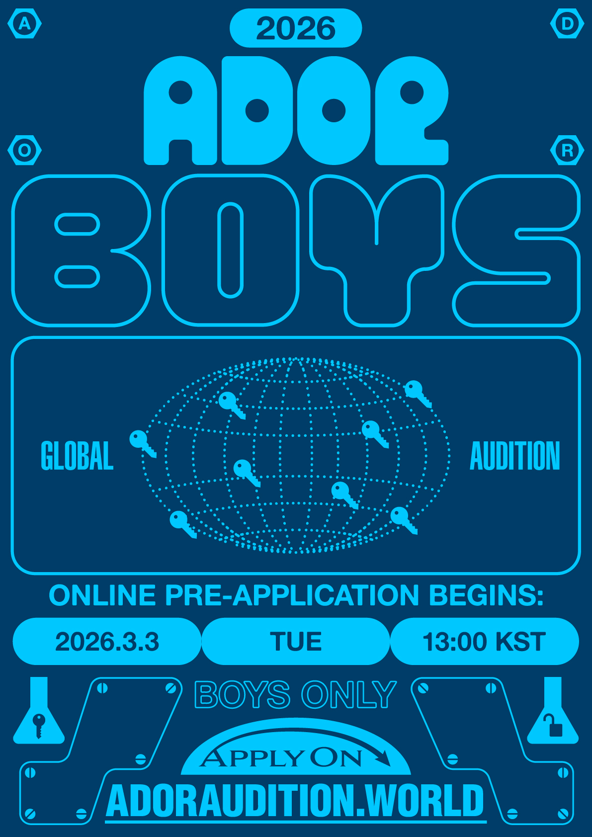 [스타뉴스|윤상근기자]/사진=어도어(ADOR)어도어(ADOR)가전세계11개주요도시에서보이그룹멤버가될재능있는인재를찾는다고3일밝혔다.'2026ADORBOYSGLOBALAUDITION(2026어도어보이즈글로벌오디션)'은2007년이후출생한남자라면누구나지원가능하다.지원분야에제한은없다.노래,춤,랩,연기,작사·작곡,브이로그,사진등자신의장점을보여줄수있는콘텐츠가있다면무엇이든제출할수있다.어도어는"온라인을통해접수한지원자모두심사위원과직접마주하는대면오디션의기회를갖는다"라며"기교나유행을따르기보다자기본연의매력과잠재력을갖춘원석을발굴할예정이니많은관심부탁드린다"라고전했다./사진=어도어(ADOR)대면오디션은서울(3월21일)을시작으로부산(3월22일),싱가포르(3월28일),오사카(4월4일),도쿄(4월5일),밴쿠버(4월10일),뉴욕(4월10일),토론토(4월12일),로스앤젤레스(4월12일),시드니(4월18일),멜버른(4월19일)에서차례차례치러진다.온라인접수는각지역대면오디션진행일사흘전에마감된다.어도어는이날오디션개최공지와함께캠페인숏폼콘텐츠도공개했다.어도어라는실험실을거친아이디어(Key)가사람의형상으로피어나새로운세계의문을지나는과정이담긴애니메이션이다.실험실(Lab),문(Door),열쇠(Key),사람(Human)네가지요소는어도어의창작프로세스를상징한다./사진=어도어(ADOR)윤상근기자[email protected]©스타뉴스&starnewskorea.com,무단전재및재배포금지