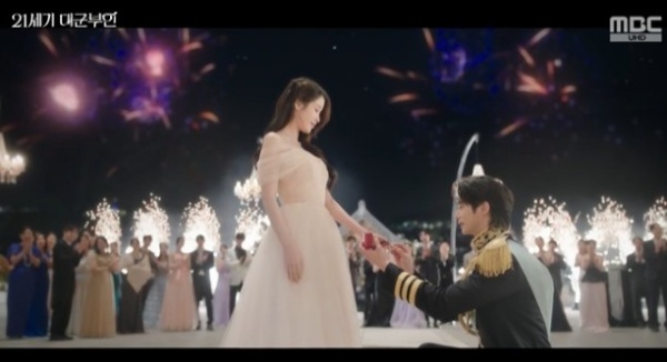 21세기대군부인/사진=MBC캡처[스포츠투데이정예원기자]'21세기대군부인'변우석이아이유에게청혼했다.25일방송된MBC금토드라마'21세기대군부인'(이하'대군부인')에서는이안대군(변우석)이성희주(아이유)에게청혼하는모습이그려졌다.이날대비윤이랑(공승연)이주최한내진연애프터파티가펼쳐진가운데,윤이랑은총리민정우(노상현)에게파트너를부탁하며팔짱을낀채입장했다.그는민정우에게이안대군의혼처로점찍어둔여인을가리키며"지나치게뛰어나지도,부족하지도않은적당한상대"라고평가했다.이때정복을차려입은이안대군과드레스를입은성희주가등장했다.두사람은나란히등장해인사를나눈뒤연주에맞춰무도회의중심에서왈츠를선보였다.이를지켜보던대비는"이안의마지막부탁이라더라.이별을위한선물을준비한것같다"며두사람의결별을기정사실처럼여겼다.그러나이안대군의선택은반대였다.춤이끝난뒤그는성희주에게다가가"잘따라와달라"고귀띔한뒤무릎을꿇고반지를꺼내들었다.의현왕후의반지였다.그는"걸음은느리지만내아내가되어주겠냐"며진심을전했고,동시에화려한폭죽이터지며분위기를더했다.성희주는미소와함께고개를끄덕였고,대비는분노를애써감췄다.두사람은박수를받으며국왕이윤(김은호)앞으로나아간뒤결혼을허락해달라고요청했다.대비가만류하려했지만,이윤은이를받아들이며"행복하라"고축복했다.격분한대비는총리에게거부권행사를지시했으나,민정우는"왕실과의충돌은불가하다"며거절하고자리를떠났다.[스포츠투데이정예원기자[email protected]]Copyright©스포츠투데이.무단전재및재배포금지.