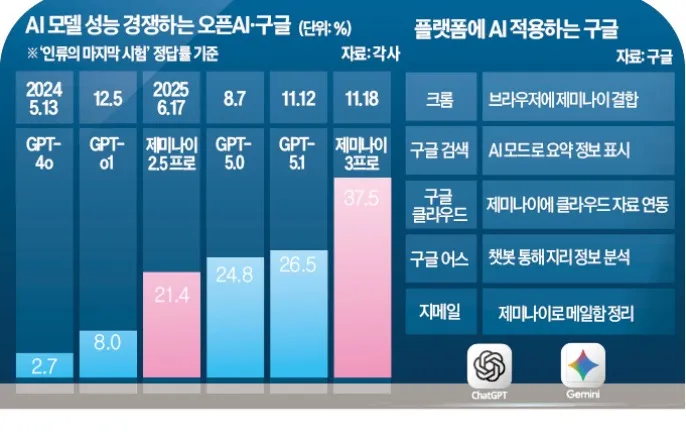 성능평가선두오른'제미나이3'생물·물리학등고난도문제풀이오픈AI챗GPT에큰격차로앞서검색성능향상정체현상해소반복시연등검색증강생성기술30년축적된검색DB와시너지복잡한질문의답변정확성높여2023년2월.구글의첫생성형인공지능(AI)바드는시연도중제임스웹우주망원경에대한오답을내놓으며망신을당했다.당시시장은“3개월전챗GPT를내놓은다윗오픈AI가골리앗(구글)을꺾었다”고평가했다.하지만불과2년여만에상황은반전됐다.최근공개된제미나이3프로는AI성능평가지표인‘인류의마지막시험’벤치마크에서오픈AI의최신모델인GPT-5.1을큰격차로따돌렸다.생물학,물리학등고난도문제2500개를푸는이테스트에서GPT-5.1은26.5%,제미나이2.5프로는21.4%를기록했다.제미나이3프로는무려37.5%의정답률을보였다.선두를빼앗긴오픈AI는‘코드레드’를발령하며비상태세에들어갔다.◇‘똑똑한검색’이비결최근AI업계는단순히데이터와컴퓨팅파워를늘리는것만으로는성능향상이정체되는‘스케일링법칙’의한계에직면해있었다.글은이벽을독자적인기술로돌파했다.핵심은지난해10월구글딥마인드가논문을통해공개한‘시연기반검색증강생성(DRAG)’기술이다.검색증강생성(RAG)은AI모델이기존에학습한데이터가아닌질문을받으면자체검색해답변을생성하는기술이다.DRAG는AI에게우수답변예제를미리학습시키고이를RAG결과와비교해정확도를높인다.구글은여기에자사검색시스템의중추인‘지식그래프’를적용했다.지식그래프는단어와단어사이의관계를형성하는기술을말한다.예를들어‘이재용패딩’을검색하면이재용삼성전자회장과패딩점퍼가별개로나오는게아니라이회장이입어유명해진빨간패딩이검색된다.DRAG는이런지식그래프기반검색을통해AI에게모범사례를보여준다.예를들어‘세종대왕맥북’과같은엉뚱한조합의단어를입력했을때,세종대왕이맥북을던졌다는문장은환각에가깝다고스스로판단한다.또하나의기술은‘반복시연기반검색증강생성(IterDRAG)’이다.이는대규모언어모델(LLM)이한번에이해하기힘든복잡한질문을여러개의하위질문으로쪼개처리하는방식이다.구글은DRAG와IterDRAG를통해답변퀄리티를획기적으로높였다,AI모델의신뢰성을평가하는심플QA베리파이드(SimpleQAVerified)테스트에서제미나이3프로는72.1%를기록하며챗GPT(51.6%)를압도했다.30년동안전세계웹사이트정보를정리해온구글의검색데이터베이스가AI의두뇌와결합하며강력한시너지를낸것이다.◇유튜브·크롬도AI학습에활용구글은자사검색엔진의검색색인(인덱스)을RAG에활용한다.검색색인은구글을검색엔진의절대강자로만든기술중하나다.사용자가구글에검색을하면,구글은전체인터넷을찾는게아니라키워드에맞는색인에서결과를도출한다.도서관에서책을하나씩열어볼필요없이분류기호로찾는것과같다.구글은20여년간웹크롤링(정보수집)을통해색인체계를구축해왔다.구글은크롬브라우저등도AI학습에동원했다.사용자가각종웹사이트에접속할때사용자가사람인지컴퓨터인지구별하는리캡차(reCaptcha)기능도AI의이미지학습에일조했다.유튜브가보유한방대한영상데이터,구글렌즈,지도,크롬브라우저등을통해획득한멀티모달데이터는구글의이미지·영상복합처리능력을경쟁사들이따라올수없는수준으로만들었다는평가가나온다,하드웨어측면에서도구글은자체생태계를구축하고있다.구글은2013년부터자체AI반도체인TPU(텐서프로세싱유닛)를개발해왔다.이는현재7세대TPU‘아이언우드’까지진화했다.엔비디아그래픽처리장치(GPU)가학습에강점이있다면,구글TPU는추론연산에특화됐다.메타가AI모델경쟁사인구글의TPU도입을검토하는것은구글의하드웨어경쟁력을보여주는사례라는분석이나온다.실리콘밸리=김인엽특파원[email protected]©한국경제.무단전재및재배포금지.