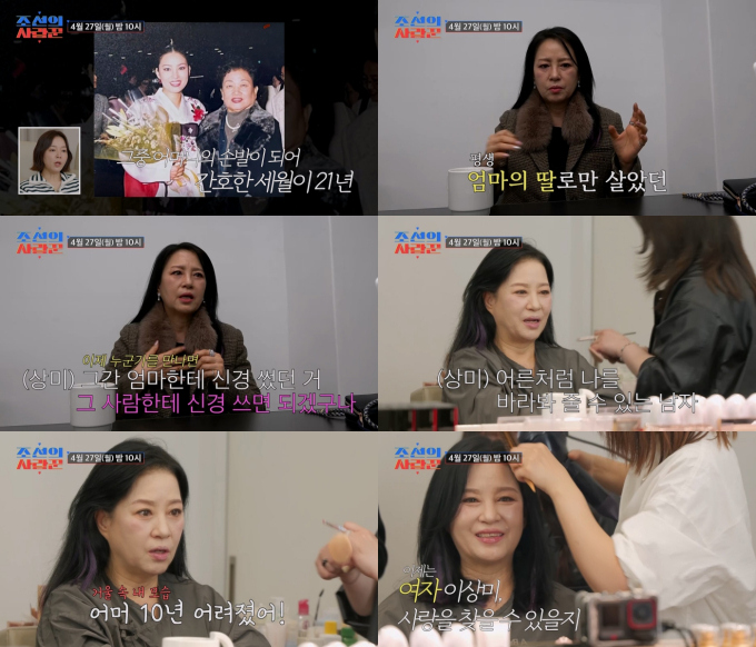 [TV리포트=하수나기자]‘조선의사랑꾼’에선64세의싱글인배우이상미가황혼소개팅에도전한다.27일TV조선'조선의사랑꾼'선공개영상에서는과거국민드라마'전원일기'에서'개똥엄마'역으로시청자들에게많은사랑을받은이상미가다시한번'조선의사랑꾼'을찾는다.이상미는"(엄마가)뇌졸중이오면서부터너무나도힘든간호를하게됐다"면서지난40년간의세월중무려21년간어머니를모시며병시중을들었다고과거를회상했다.그는앞서"(누군가를만나면)그간엄마한테신경썼던거,그사람한테신경쓰면되겠구나..."라며황혼소개팅에용기를낸솔직한이유를밝힌바있다.공개된영상속이상미는새로운만남을앞두고메이크업을받았다.그는"화사하고어려보이게해달라.중요한날이다.바깥의신부보다예쁘게해달라"면서들뜬마음을감추지못했다.이어"우리아빠같은마음씨를갖고계신분,어른처럼나를바라봐줄수있는남자..."라고이상형을꼽으며만날상대에대한설렘을드러냈다.이상미는"10년은어려졌다"며메이크업이끝난자기모습에화들짝놀라는순수한소녀같은모습으로훈훈함을자아냈다.마침내자신만의행복을찾아나선이상미가좋은인연을만날수있을지귀추가주목된다.‘조선의사랑꾼’은4월27일(월)오후10시에공개된다.하수나기자/사진제공=TVCHOSUN‘조선의사랑꾼’Copyright©TV리포트.무단전재및재배포금지