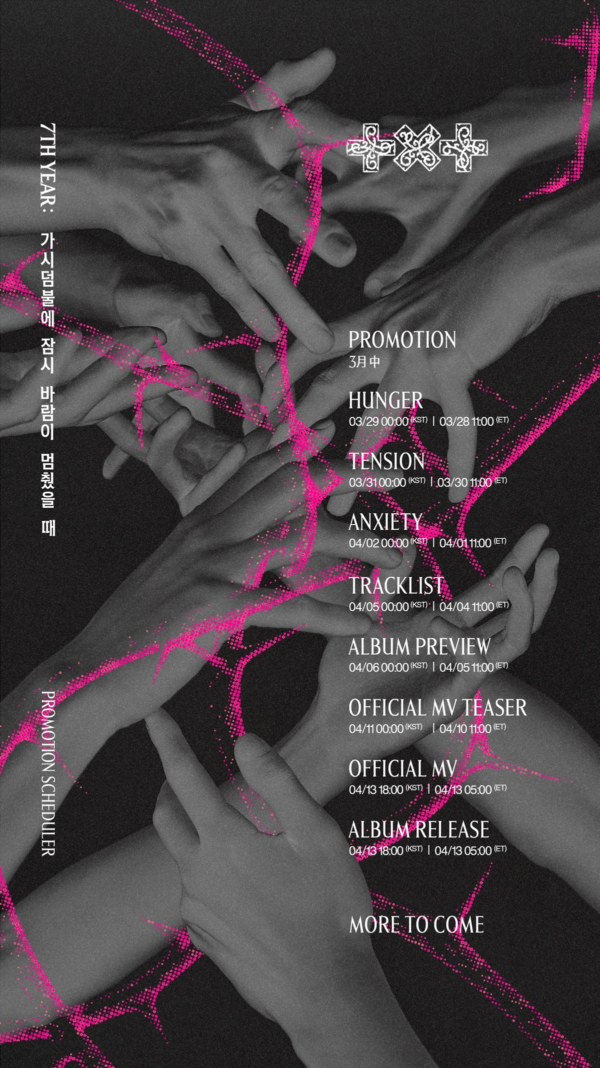 빅히트뮤직투모로우바이투게더(TXT)가다채로운프로모션으로재계약후첫컴백에대한기대감을끌어올린다.투모로우바이투게더(수빈,연준,범규,태현,휴닝카이)는5일0시팀공식SNS에미니8집‘7THYEAR:가시덤불에잠시바람이멈췄을때’프로모션스케줄러를공개했다.흑백톤의이미지속뒤엉킨멤버들의손사이로형광빛가시덤불이뻗어나간다.대비를이루는색감과가시를시각화한상징적인오브제가어우러져강렬한인상을남긴다.투모로우바이투게더는앞서신보의분위기를담은공식트레일러와‘THORN’버전의콘셉트포토를공개해새로운챕터의서막을열었다.오는3월29일부터4월2일까지‘HUNGER’,‘TENSION’,‘ANXIETY’버전의사진이추가적으로베일을벗는다.이후4월5일트랙리스트,4월6일앨범프리뷰가공개돼신보윤곽이드러난다.4월11일에는타이틀곡뮤직비디오티저로컴백열기를고조시킬전망이다.3월중전개되는베일에싸인프로모션과‘MORETOCOME’이라는문구는전세계모아(MOA.팬덤명)의호기심을자극한다.투모로우바이투게더는4월13일오후6시미니8집‘7THYEAR:가시덤불에잠시바람이멈췄을때’전곡음원과타이틀곡뮤직비디오를공개한다.신보발매당일오후8시고려대학교화정체육관에서온·오프라인컴백쇼케이스를개최하고전세계팬들과함께새로운챕터를연다.손봉석기자[email protected]©스포츠경향.무단전재및재배포금지.