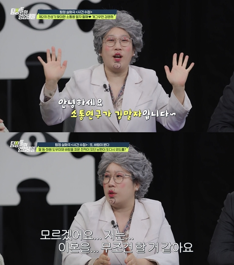 [스포츠동아이정연기자]개그우먼김영희가“남편이바람피우면무조건이혼”이라고단호한소신을밝힌다.2일밤10시방송되는채널A예능프로그램‘탐정들의영업비밀’의‘사건수첩’에는“과거외도를용서했지만또다시불륜이의심된다”는한여성의사연이소개된다.미용실을운영중인의뢰인은8년전딸의초등학교입학과함께등·하원을도와줄도우미를구했고,같은아파트에거주하던여성을믿고가까이지내게됐다고전한다.의뢰인은미용실손님으로부터“직장에있어야할시간에남편이집으로들어갔다”는말을듣고집으로향했고,남편과도우미의불륜현장을목격하게됐다고밝힌다.이후이혼을결심했지만,충격으로외상후스트레스장애를겪던딸때문에결혼생활을유지했다고털어놓을예정이다.최근에는남편의휴대전화로“그여자어땠어?”라는수상한문자가도착했고,의뢰인은또다시외도를의심하게됐다고말한다.탐정단은남편을며칠간추적하지만뚜렷한정황은발견하지못한다.그러나이후의뢰인남편과직장상사들이향한뜻밖의장소가공개되며상황이반전될것으로예고된다.이날방송에는‘말자할매’로제2의전성기를맞은김영희가일일탐정으로출연한다.김영희는“남편이바람을피워도아이때문에참고살수있느냐”는질문에“내가불행하면아이에게도영향이간다.나는무조건이혼할것”이라며엄마로서의분명한입장을밝힐예정이다.채널A‘탐정들의영업비밀’은2일밤10시방송된다.이정연기자[email protected]©스포츠동아.무단전재및재배포금지.