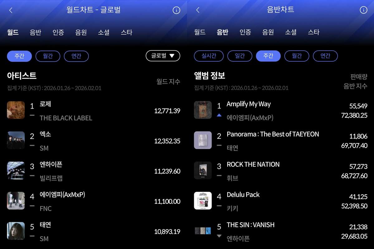한터차트제공가수로제(ROSÉ)와그룹에이엠피(AxMxP)가한터차트1월5주주간차트1위의영예를안았다.세계유일의실시간음악차트인한터차트는2일오전10시,2026년1월5주차주간차트를발표했다.이에따르면로제와에이엠피가한터차트1월5주차월드차트와음반차트에서각각1위를차지했다.주간월드차트에서는로제가글로벌파워를과시했다.로제는미디어와소셜부문에서높은점수를획득하며1만2771.39점의월드지수를얻었다.이어엑소가월드지수1만2352.35점으로2위,엔하이픈이월드지수1만1239.60점으로3위에자리했다.주간음반차트에서는에이엠피가정상에올랐다.에이엠피는첫번째정규앨범‘AxMxP’로1월5주음반지수7만2380.25점(판매량5만5549장)을기록하며1위를차지했다.주간음반차트2위는음반지수6만9707.40점(판매량1만1806장)을기록한태연의솔로데뷔10주년기념베스트앨범‘Panorama:TheBestofTAEYEON’이며,3위는음반지수6만8727.60점(판매량5만7273장)의휘브첫번째미니앨범‘ROCKTHENATION’이다.한터차트의1월5주차주간차트집계기간은지난1월26일부터2월1일까지다.월드차트는음반,음원,인증,SNS,미디어등케이팝아티스트의글로벌데이터를바탕으로집계,발표되며,음반차트순위는전세계음반판매량을바탕으로한음반지수가기준이다.각앨범차트성적및판매량에대한더자세한내용은모바일‘후즈팬(Whosfan)’앱과한터차트홈페이지에서확인할수있다.안병길기자[email protected]©스포츠경향.무단전재및재배포금지.