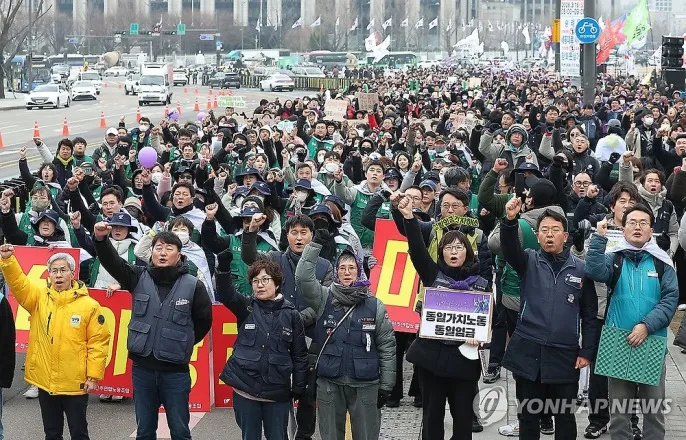 민주노총·여성파업조직위등행진광화문앞에서열린3·8세계여성의날전국노동자대회(서울=연합뉴스)김성민기자=전국민주노동조합총연맹(민주노총)조합원들이6일서울종로구광화문인근에서열린3·8세계여성의날전국노동자대회에서구호를외치고있다[email protected](서울=연합뉴스)조현영이율립기자=8일'세계여성의날'을앞두고시민사회단체들이실질적성평등을촉구하며서울도심곳곳에서집회를열었다.전국민주노동조합총연맹(민주노총)은6일오후종로구광화문동십자각에서'세계여성의날정신계승전국노동자대회'를개최했다.집회에는주최추산1천800명,경찰비공식추산1천명이참가했다.민주노총은투쟁선언문을통해직장내성차별구조를바꾸는성평등단체협약체결,성평등임금공시제도입,차별금지법제정등을촉구했다.또미국과이스라엘의이란침공을규탄하며성차별을공고하게만드는전쟁을중단해야한다고도했다.성평등모범조합원상을받은민주일반연맹민주연합노조속초지부장정순씨는"여성이라는이유로더많이견디지않아도되는일터가다음세대에게당연한곳이되길바란다"고말했다.인권운동네트워크바람등32개단체가모인3·8여성파업조직위원회도오후서울역광장에서'여성파업대회'를열었다.이자리에는성차별임금개선을촉구하는구미KEC노조간부들과여성긴급전화1366콜센터노동자들이부분파업으로참가했다.민주연합노조톨게이트지부,전국학습지산업노조,건강보험고객센터상담노동자들도동참하며경찰비공식추산150명이모였다.박은영공공운수노조서울지부1366서울센터분회장은"한달에7∼8번밤새워일하며이틀연속쉬는일이거의없다"며"여성의노동이'원래이런일','희생과서비스정신'이라는말로값싸게쓰이고있다"고비판했다.참가자들은'여성파업'이라적힌보라색머리띠를착용하고'지금바로여기에실질적성평등을','차별금지법을제정하라'는등의문구가적힌피켓을들었다.또가사사용인·이주노동자·프리랜서의노동기본권쟁취와돌봄일자리확대,비동의강간죄도입등을주장했다.집회를마친이들은민주노총전국노동자대회가열린광화문으로행진해합류했다.직장갑질119젠더폭력특별위원회도광화문이순신동상앞에서'직장내성희롱死(사)각지대'개선요구기자회견을열었으며,공공연대도오후서울역광장에서여성의날기념기자회견을했다.세계여성의날앞두고행진하는민주노총(서울=연합뉴스)김성민기자=전국민주노동조합총연맹(민주노총)조합원들이6일서울용산구KDB생명타워인근에서3·8세계여성의날전국노동자대회가열리는광화문동십자각방면으로행진하고있다[email protected]@yna.co.kr▶제보는카톡okjeboCopyright©연합뉴스.무단전재-재배포,AI학습및활용금지