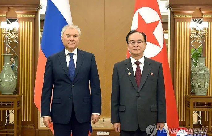 고위급교류활발…20~24일방북내무부대표단,나포된美정보함푸에블로호참관기념촬영하는북한조용원과러하원의장(평양조선중앙통신=연합뉴스)조용원북한최고인민회의상임위원회위원장과뱌체슬라프볼로딘러시아하원(국가두마)의장의회담이지난25일금수산영빈관에서진행됐다고조선중앙통신이26일보도했다.사진은기념촬영하는뱌체슬라프볼로딘러시아하원(국가두마)의장(왼쪽)과조용원북한최고인민회의상임위원회위원장(오른쪽).2026.4.26[국내에서만사용가능.재배포금지.ForUseOnlyintheRepublicofKorea.NoRedistribution][email protected](서울=연합뉴스)이은정기자=평양에서열리는쿠르스크파병전사자추모기념관준공식에참석하기위해러시아고위급대표단이방북하면서북한과러시아가끈끈한동맹을과시했다.조선중앙통신은최고인민회의와국방성의초청에따라해외군사작전전투위훈기념관준공식에참가하기위해뱌체슬라프볼로딘러시아하원(국가두마)의장을단장으로하는러시아공식대표단이25일평양에도착했다고26일전했다.조용원최고인민회의상임위원장과김정규외무성부상이공항에나가대표단을영접했다.앞서김정은국무위원장이파병기념관건설을여러차례현지지도하면서'쿠르스크해방1돌'을준공일로제시한만큼,준공식은오는26일열릴것으로보인다.우크라이나와전쟁과정에서쿠르스크를한때빼앗겼던러시아는작년4월26일쿠르스크영토회복을공식선언했다.해방탑에헌화하는러시아대표단(평양조선중앙통신=연합뉴스)'해외군사작전전투위훈기념관'준공식에참가하기위해방북한뱌체슬라프볼로딘러시아하원(국가두마)의장을단장으로한공식대표단이지난25일해방탑에화환을진정했다고조선중앙통신이26일보도했다.2026.4.26[국내에서만사용가능.재배포금지.ForUseOnlyintheRepublicofKorea.NoRedistribution][email protected]러시아대표단은옛소련군을추모하는상징물인해방탑을찾아묵념한뒤금수산영빈관에서조용원최고인민회의상임위원장과회담했다.양측은의회간교류협력확대방안등에대해의견을교환하고,평양에서열린북러정상회담이이룬양국간합의에대한이행의지를재확인했다.조상임위원장은"러시아연방지도부가해외군사작전전투위훈기념관준공식에고위급대표단을파견한것은해외작전부대참전열사들의빛나는삶을경건히회억하며그들의영생을기원하고있는우리인민에대한전체러시아인민의진심어린지지와경의심의표시"라고말했다.볼로딘의장은"쿠르스크주에서우크라이나신나치스강점자들을몰아내는데지원을준김정은동지와전체조선인민에게진심으로되는사의를표한다"면서"러시아는쿠르스크주해방작전에서자기의목숨을아낌없이바친조선의영웅적인군관들과병사들의위훈을영원히잊지않을것"이라고화답했다.최고인민회의는이날저녁러시아대표단을환영하는연회를마련했다.북한조용원과러하원의장회담진행(평양조선중앙통신=연합뉴스)조용원북한최고인민회의상임위원회위원장과뱌체슬라프볼로딘러시아하원(국가두마)의장이지난25일금수산영빈관에서회담을진행했다고조선중앙통신이26일보도했다.2026.4.26[국내에서만사용가능.재배포금지.ForUseOnlyintheRepublicofKorea.NoRedistribution][email protected]북러는'쿠르스크해방작전종결'1주년을계기로고위급인사교류를통해혈맹관계를부각하고있다.러시아공산당겐나디안드레예비치주가노프중앙위원회위원장은23일김정은국무위원장에게첫방러7주년과쿠르스크해방1주년을기념하는축전을보냈다고중앙통신이전했다.주가노프위원장은축전에서'포괄적전략적동반자관계조약'체결로"우리의관계는전례없이높은수준에도달하고새로운시대에들어서게됐다"고말했다.그는"당신의결정에따라신나치스침략자들로부터쿠르스크주를해방하기위하여이지역에조선인민군부대들이전개됨으로써조약에명기된조항들이완전무결하게이행"됐다며"전투적우의의공고성과불패성이전세계에과시"됐다고평가했다.이어"러시아를위하여,우리의공동의자유를위하여피를흘리고목숨을바친영용한조선군인들의영웅적위훈을절대로잊지않을것"이라며양국간친선강화를위해노력하겠다고밝혔다.방북러시아내무성대표단'전승기념관'참관(평양조선중앙통신=연합뉴스)블라디미르콜로콜체프러시아내무상을단장으로하는러시아대표단이지난23일조국해방전쟁승리기념관을참관했다고조선중앙통신이24일보도했다.2026.4.24[국내에서만사용가능.재배포금지.ForUseOnlyintheRepublicofKorea.NoRedistribution][email protected]앞서블라디미르콜로콜체프장관이이끄는러시아내무부대표단도지난20~24일북한을방문해평양시내지하철,조국해방전쟁승리기념관과원산갈마해안관광지구등을둘러봤다.북한매체가공개한사진을보면대표단은평양보통강변에전시된미해군정보수집함푸에블로호도참관했다.푸에블로호는1968년1월원산근해에서정보를수집하던도중나포됐으며,북한은선체를전시해체제선전의도구로활용해왔다[email protected]▶제보는카톡okjeboCopyright©연합뉴스.무단전재-재배포,AI학습및활용금지