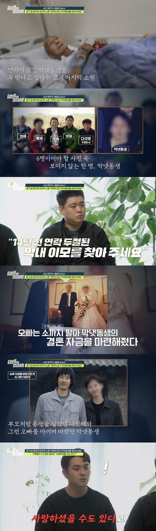 [OSEN=최이정기자]'탐정들의영업비밀'이말기암으로생의끝자락에선한남자의마지막소원을이루기위한전례없는긴급의뢰를공개한다.9일(월)오후10시방송되는채널A'탐정들의영업비밀'속'탐정24시'에서는말기암으로투병중인구철회씨(68)의간절한사연이그려진다.의뢰인은그의조카로,"삼촌에게남은시간이많지않은데막내이모를너무보고싶어하신다"며14년전연락이끊긴막내이모를찾아달라고다급히요청한다.제작진은의뢰인과함께구철회씨가입원중인병원을찾아그의이야기를들었다.병상에누운그는"내가언제죽을지모르니까..."라며십여년전연락이끊긴막냇동생을꼭한번만만나고싶다는마지막소원을털어놓는다.구철회씨는2025년여름위암과간암4기판정을받았고,의료진으로부터"길어야2~3개월남았다"는시한부선고를받은상태다.의뢰인은"그래도삼촌이살고싶다는마음을계속내비치신다"고전해안타까움을더한다.구철회씨의누나역시"어떻게든막내얼굴한번이라도보고가면좋겠다.막냇동생도뒤늦게오빠소식을듣고후회하지않도록,그전에서로얼굴이라도봤으면좋겠다"며눈물을훔친다.이어데프콘은"동생을찾을거라는기대로몇번이나고비를넘기셨다고한다"며구철회씨의안타까운소식을전한다.구철회씨와막냇동생은타지로떠난형제들을대신해고향에남아부모님을모시며농사를지었다.특히구철회씨는가장역할을하며집안을책임졌고,결혼마저포기해야했다.그런오빠를위해막냇동생은부모님에게"왜다섯째오빠를일꾼처럼부려먹느냐,오빠가머슴이냐"며늘그의편에섰다.구철회씨역시동생에게"남들다가는중학교조차보내주지못했다"며오래도록자책해왔다.막냇동생이결혼할때는전재산이나다름없던소를팔아결혼자금을마련해줄정도로,두사람은누구보다각별한남매였다.이를들은데프콘은"아낌없이다주셨네요...애틋할수밖에없다"며안타까움을감추지못한다.하지만2012년,막냇동생은갑작스럽게가족들과의연락을모두끊고자취를감췄다.가족들은집을찾아가고수차례전화를걸며수소문했지만,막냇동생가족모두전화번호를바꾸면서연락이닿지않았다.심지어심부름센터에까지의뢰했지만"개명을했을수도있고,사망했을가능성도있다"는충격적인답변만돌아왔다.14년전가족곁을떠나자취를감춘막냇동생에게과연어떤사연이있었던것일지,그리고탐정단은생의마지막순간을앞둔구철회씨의간절한소원을이뤄줄수있을지,그결과가주목된다./[email protected][사진]'탐정들의영업비밀'Copyright©OSEN.무단전재및재배포금지.