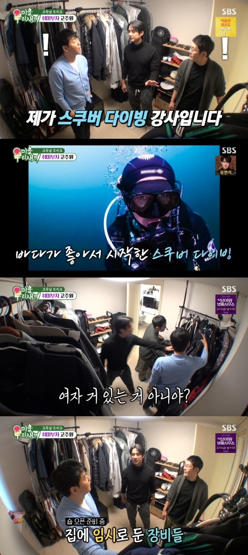 ‘미운우리새끼’사진|SBS배우고주원이근황을알렸다.8일오후방송된SBS예능프로그램‘미운우리새끼’(이하‘미우새’)에는배우고주원이새로운미우새로등장했다.이날방송에서배우김승수와이민우가그의집에방문했다.두사람은고주원의집을둘러보다가스쿠버장비들이즐비하게놓여있는것을보고의문을자아냈다.이에고주원은“제가스쿠버다이빙강사다”라고깜짝고백하기도.이민우는“여기에여자옷있는것아니냐”며의문을자아냈고고주원은“교육생들거다”라며진땀을뺐다.다이빙숍오픈예정이라는고주원은스쿠버다이빙이외에도스노보드,낚시등다양한취미를즐긴다고밝혔다.소믈리에자격증까지땄다는고주원에게이민우는“공부잘하는사람은술도열정적으로마신다”며감탄했다.실제로고주원은수능400점만점에390점이라고.‘미운우리새끼’는일요일오후9시5분SBS에서방송된다.[서예지스타투데이객원기자]Copyright©스타투데이.무단전재,재배포및AI학습이용금지