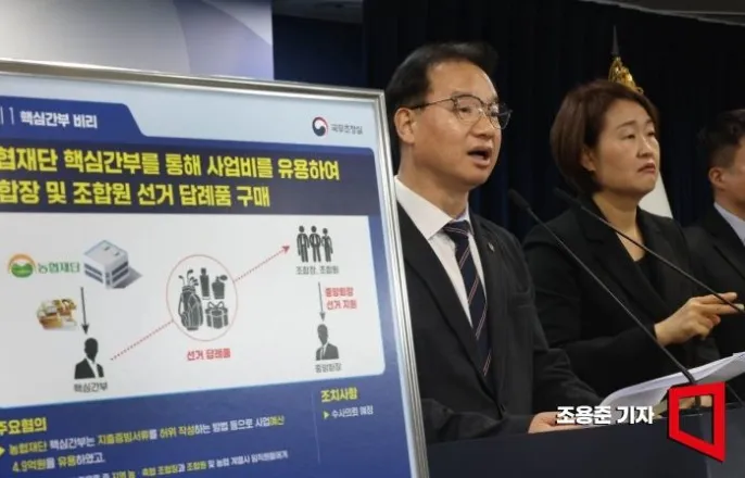 '농협정부합동특별감사'결과위법소지큰14건수사의뢰조만간'농협개혁방안'마련·발표강호동농협중앙회장은2024~2025년농협재단간부를통해재단사업비를유용해중앙회장선거에도움을준조합장·조합원·임직원등에게선물·답례품등총4억9000만원가량을배포했다.강회장은취임1주년명목으로지역조합운영위원회로부터황금열쇠10돈(580만원상당)을받았다가나중에이를돌려주기로했다.정부는이번특별감사와'농협개혁추진단'논의를통해개혁방안을마련하고,조속한시일내에발표할예정이다.정부는이같은내용을담은농협중앙회·자회사·회원조합등에대한특별감사결과를9일발표했다.정부는농협비위근절과투명성강화를위해국무조정실과농림축산식품부,금융위원회·금감원,감사원,공공기관,외부전문가등이참여하는'정부합동특별감사반'을구성해올해1월26일부터특별감사를실시했다.이번감사는지난해농식품부가실시한선행감사(2025년11월24일~12월19일)의후속감사로농협중앙회·자회사등의운영실태전반을점검했다.선행감사에서추가사실규명이필요했던사항38건과익명제보를기초로선정한12개회원조합에대해서도감사를실시했다.김영수국무조정실국무1차장이9일서울종로구정부서울청사에서농협정부합동특별감사결과를발표하고있다.조용준기자김영수국무조정실국무1차장은"이번감사에서농협핵심간부들의위법과전횡,특혜성대출·계약,방만한예산집행이광범위하게발생하고있으며,이는작동하지않는내부통제장치및금품에취약한선거제도와무관하지않음을확인했다"며"정부는위법소지가큰공금의사적유용과특혜성대출등14건에대해수사의뢰하고,지적된사항들이시정될수있도록96건(잠정)에대해제도개선안등을마련해처분할계획"이라고말했다.이어그는"후속조치관련해서농협에대한전반적인경영이라든지각종개선사항을농식품부중심으로준비를실무적으로는거의마무리상태에있다"며"이번감사결과와연계해개선조치에대한결과는빠른시일내에발표할수있도록협의하겠다"고덧붙였다.◆중앙회장금권선거만연=감사결과에따르면농협재단핵심간부A는홍보용쌀국수구매대금등재단사업비를유용해강회장선거에도움을준조합장·조합원·임직원에게제공하는답례품·골프대회협찬비용으로4억9000만원을지출했다.중앙회B부서는총2억4000만원어치의홍삼·화장품등기념품을구매해회장실·부회장실로전달하기도했다.지난해2월C지역조합운영위원회는강회장취임1주년기념을명목으로황금열쇠10돈(580만원상당)을전달했다.강회장은상당기간이지난후이를반환했다.정부는강회장이청탁금지법을위반한것으로보고수사의뢰했다.강호동농협중앙회장이1월13일농협중앙회본관에서대국민사과문을발표하고있다.주상돈기자김차장는"중앙회의다른핵심간부는현중앙회장선거비위관련기사를무마하기위해해당신문사에광고비를대폭증액해집행한의혹도있다"며"중앙회장관련혐의등위법소지가큰6건에대해서수사의뢰할예정"이라고강조했다.수사를통해강회장에대한혐의가확정되면농식품부장관은직무정지등의조치를할수있다.다만혐의확정까지는장기간이소요될전망이다.2024년3월시작한강회장의임기는4년으로2028년3월까지다.◆객관평가없이선심성으로포상금지급=독단적조합운영도확인됐다.지난해중앙회·경제지주이사회는경제지주스마트농업로컬팀의중앙회이관을의결했으나,중앙회장은이를이행하지않았다.또최근5년간포상금의일종인직상금75억원의경우객관적성과평가없이특정회원조합·부서에선심성으로무분별하게지급되기도했다.과도한특혜도감사결과확인됐다.중앙회장과임원들은다른협동조합과비교해최소3배이상많은퇴임공로금(퇴직금)을받고있었다.기준보다넓고고가인업무용사택을받기도했다.전중앙회장은퇴직금으로3억2000만원을지급받았고,현중앙회장은전용면적기준(60㎡)을위반한84.98㎡의사택전세계약을했다.전세보증금상한선도5억원이지만이를7억원초과한12억원짜리전셋집을이용했다.중앙회가농협경제지주의요청으로거액신용대출을부적절하게취급하거나,퇴직임원이재취업한업체에거액을대출하는등특혜성대출·투자사례도적발됐다.2022년중앙회는신설법인(냉동식품제조)에대한거액(145억원)의신용대출을부적정하게취급해지난해2월부터부실(연체)발생했다.또자회사D는2011년부터농협퇴직자단체가출자영리법인이농협건물을무상사용하도록해회사에15년간약37억원의손해초래하기도했다.◆황금열쇠나눠먹고·가족동반해외연수도=방만한예산·재산관리사례도확인됐다.조합장과임원들은각종수당·기념품·선물·상조비를지원받고있으며,중앙회·자회사임원들도황금열쇠·전별금등을퇴직시지급받는등나눠먹기식으로예산이집행되고있었다.정부는황금열쇠·고가기념품등소득세법상퇴직·기타소득에대해원천징수를하지않은경우자진원천징수·납부하도록할방침이다.외유성해외연수도만연했다한자회사는2024년업무연관성이부족한조합장등을대상으로1인당약1000만원의해외연수를지원했다.조합장·임원배우자동반해외견학을가거나,2박3일제주도일정중견학은2시간에불과한외유성견학도확인됐다.회원조합의비