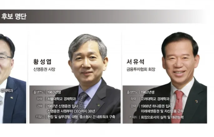 이현승·황선엽·서유석후보로출마…증시활성화·IB혁신·디지털자산제도화등임무차기금융투자협회장이18일열리는임시총회에서최종결정된다.사진은후보(왼쪽부터기호순)로나선3인./사진=각사,그래픽강지호기자차기금융투자협회장이18일서울여의도금융투자센터불스홀에서열리는선거를통해최종결정된다.선거는후보로나선이현승(기호순)전KB자산운용대표,황성엽신영증권대표,서유석현금융투자협회장의3파전으로진행된다.이날금융투자업계등에따르면금투센터불스홀에서열리는임시총회에서7대금투협회장선거를진행한다.임시총회는이날오후3시에열리고결과는당일오후5시에나온다.차기회장의임기는내년1월부터오는2028년12월까지3년이다.이번선거는현회장의첫연임도전과더불어많지않은후보수등으로주목받았다.기호1번이현승전KB자산운용대표는1966년생이며메릴린치증권을거쳐SK증권,코람코자산운용,현대자산운용,KB자산운용등증권사와운용사에서대표를역임했다.증권사와운용사대표이사경력만16년동안역임한'자본시장전문가'로꼽힌다.그는32회행정고시로공직에입문해관료경력도다수보유했다.'금융투자조세지원센터'를설립해조세관련규제개선과상품·서비스를개발하겠다고약속했다.디지털자산시장의혁신금융상품의조속한도입도강조했다.기호2번황성엽신영증권대표는금융투자협회의역할에대해정책이슈가발생할때마다개별민원을전달하는방식을넘어업무권역전체의의견을사전에정리해정책방향을제안하는구조로바꾸겠다고자신했다.그는모험자본공급을막는인허가제도의불확실성을비롯한가계자산구조등을개선해야한다는입장이다.황대표는1963년생으로1987년신영증권에입사해사원부터CEO까지38년동안자본시장에몸담았다.기호3번인서유석현금투협회장은업무의연속성을강조했다.그는1962년생으로1988년하나증권에입사했다.미래에셋그룹초창기멤버인그는2016~2021년까지는미래에셋자산운용대표이사사장을맡았고2023년부터금투협6대회장으로재임했다.그는투자자들을위한세금과제도개편안등업계현안을중요한과제로꼽았다.서금투협회장은"금융투자협회는의사결정기관이아닌논의기구"라며"정책실현을위해선금융당국과국회와의협업이필수적"이라고말했다.그는금융위원회,금융감독원,국회등임기3년동안구축한대관네트워크를핵심자산으로제시했다.이날결정되는차기급투협회장에게는국내증시활성화와IB(기업금융)혁신,디지털자산제도화등굵직한과제를처리해야하는중요한임무가주어졌다.선거는회원사의비밀투표로진행되며투표권은회원사의규모와회비납부액등에따라차등부여된다.이예빈기자[email protected]©머니S&moneys.co.kr,무단전재및재배포금지