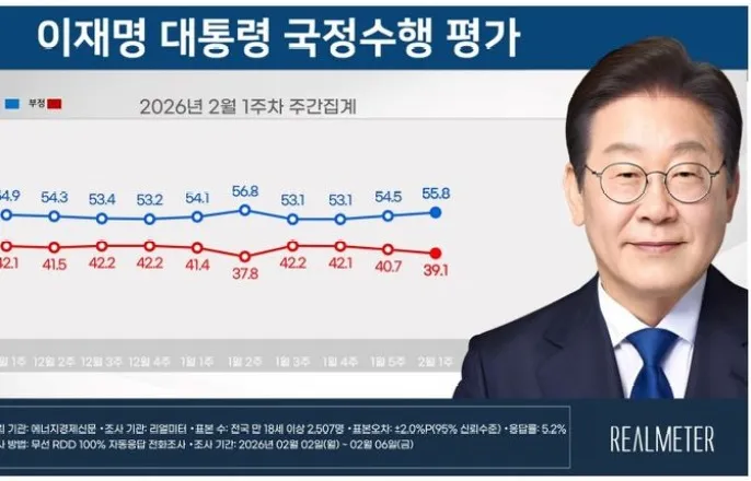이재명대통령2월1주차국정수행평가.리얼미터제공이재명대통령의국정수행지지도가55.8%로2주연속상승세를보였다는여론조사결과가9일발표됐다.여론조사회사리얼미터가에너지경제신문의뢰로지난2일부터6일까지전국18세이상2507명을대상으로조사한결과이대통령의국정수행을긍정평가한응답자는55.8%였다.이는직전조사보다1.3%포인트(p)상승한수치다.부정평가는39.1%로직전조사보다1.6%p떨어졌으며,‘잘모름’이라고응답한비율은5.1%로집계됐다.긍정평가는광주·전라(14.5%p↑),대구·경북(2.5%p↑),서울(1.3%p↑),남성(2.6%p↑),70대이상(4.4%p↑),20대(3.0%p↑),40대(1.7%p↑),50대(1.6%p↑)등에서올랐다.반면대전·세종·충청(5.9%p↓),60대(1.6%p↓),30대(1.0%p↓)보수층(1.0%p↓)에선하락했다.리얼미터는“부동산다주택투기규제및물가관리등체감도높은민생대책과더불어대기업채용유도,남부내륙철도착공과같은경제활성화·균형발전행보가지지율상승을견인한것으로판단된다”고분석했다.아울러지난5일부터6일까지전국18세이상1005명을대상으로한정당지지도조사에서더불어민주당은47.6%,국민의힘은34.9%의지지율을보였다.민주당은지난주대비3.7%p올라3주연속상승세를이어갔다.국민의힘은같은기간2.1%p하락하며2주연속떨어졌다.조국혁신당은2.6%,개혁신당은3.3%,진보당은1.3%지지율을보였다.무당층은8.9%였다.두조사는모두무선자동응답방식으로이뤄졌다.대통령국정수행지지도조사의표본오차는95%신뢰수준에±2.0%p,정당지지도조사표본오차는95%신뢰수준에±3.1%p다.대통령국정수행지지도조사응답률은5.2%,정당지지도조사응답률은4.6%였다.자세한내용은중앙선거여론조사심의위원회홈페이지를참조하면된다.정혜선기자[email protected]©쿠키뉴스.무단전재및재배포금지.